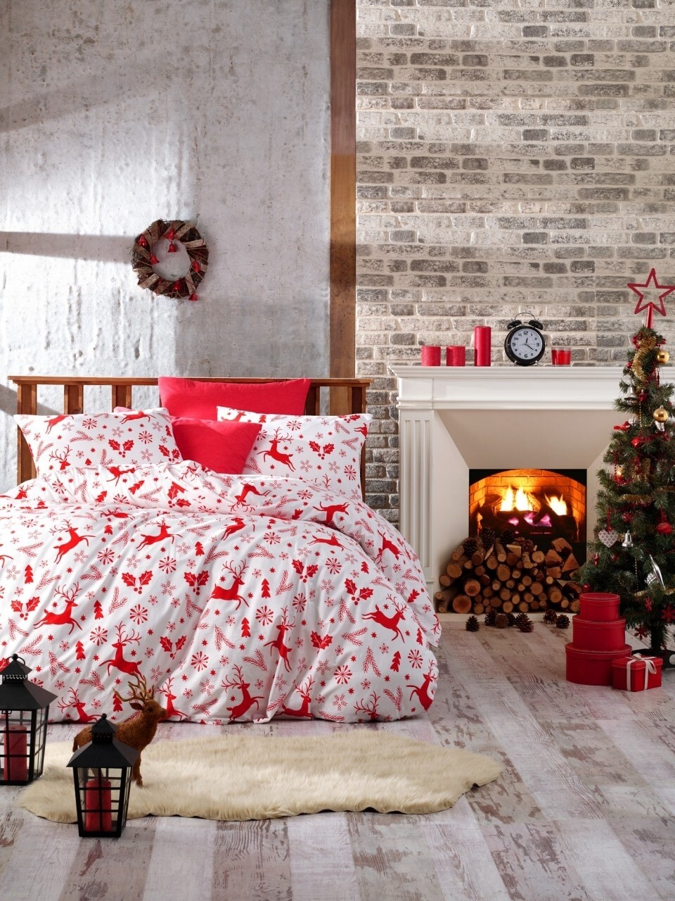 Lenjerie de pat dubla, 4 piese, 100% bumbac ranforce, Nazenin Home, Deer Red, alb/rosu