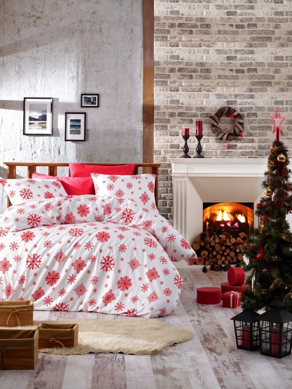 Lenjerie de pat dubla, 4 piese, 100% bumbac ranforce, Nazenin Home, Snow Red, alb/rosu