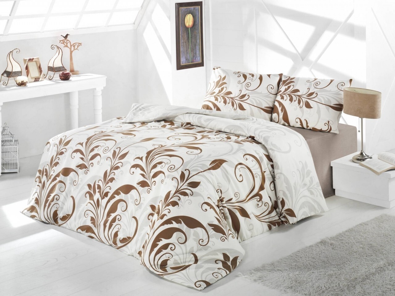 Lenjerie de pat dubla, 4 piese, amestec bumbac, Nazenin Home, Calina Brown, alb/maro