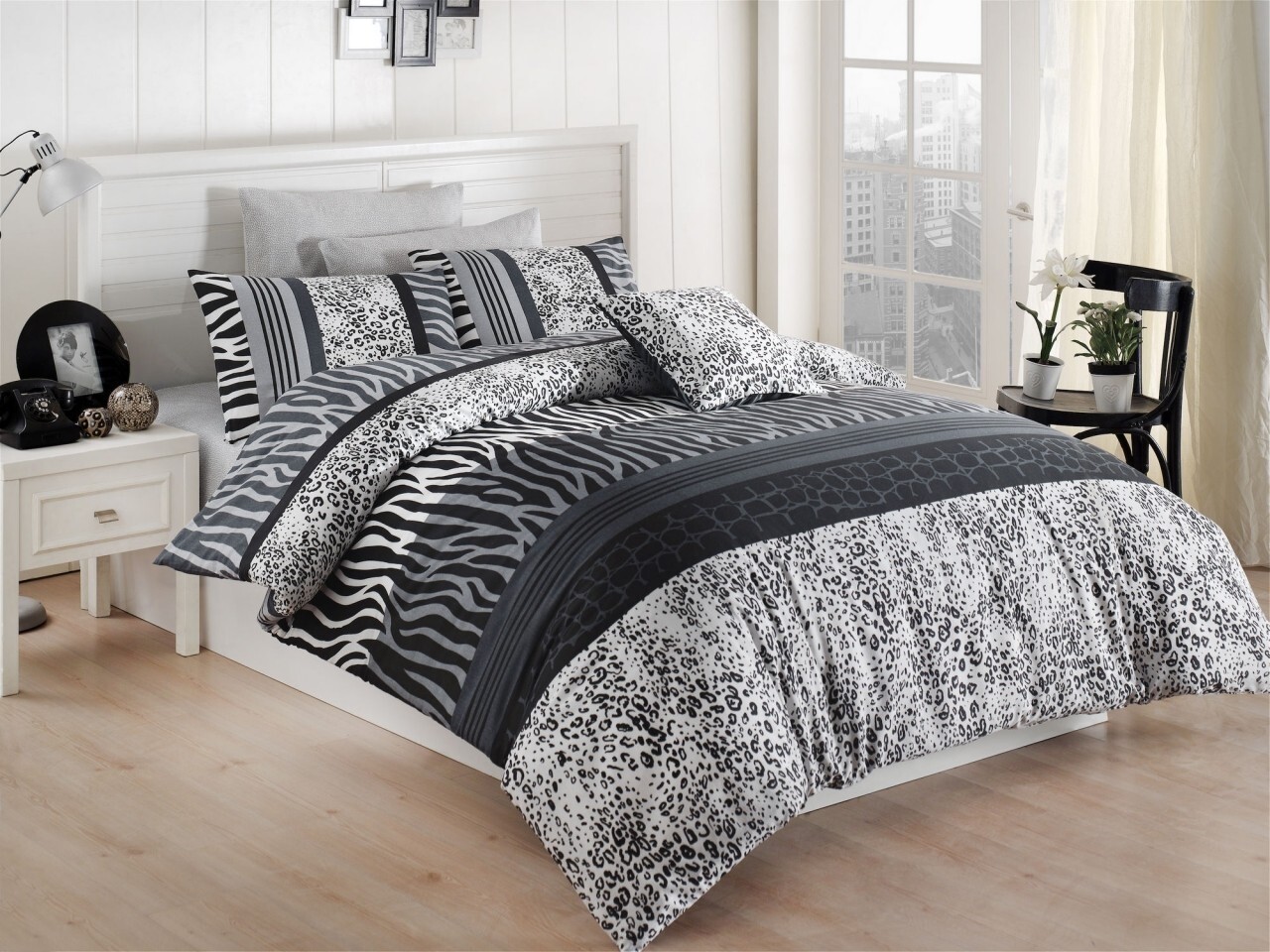 Lenjerie de pat dubla, 4 piese, amestec bumbac, Nazenin Home, Cheta Grey, alb/gri