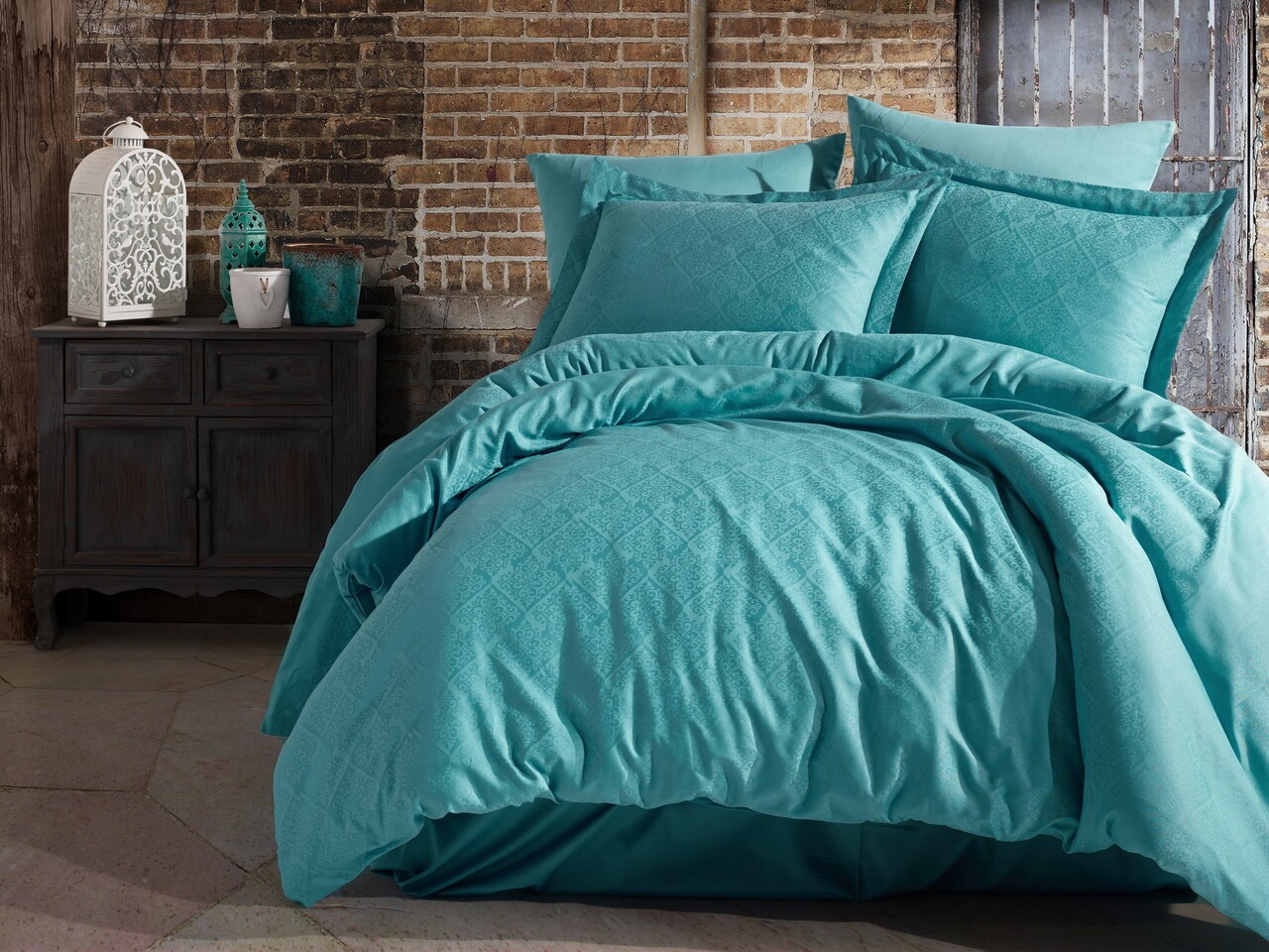 Lenjerie de pat dubla, 6 piese, 200x220 cm, 100% bumbac satinat, Saheser, Damaks, turcoaz