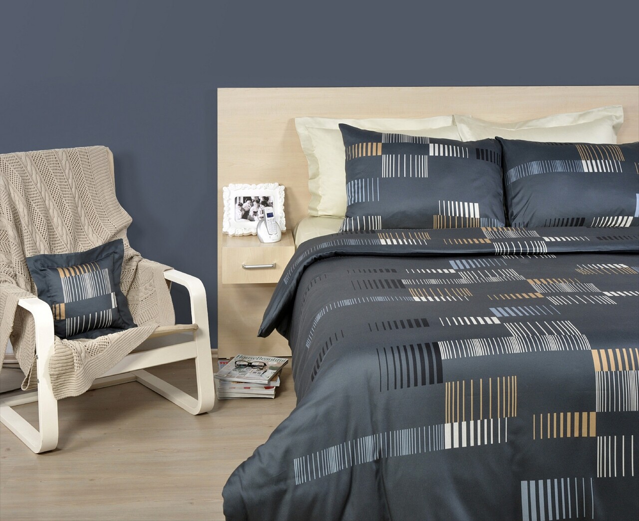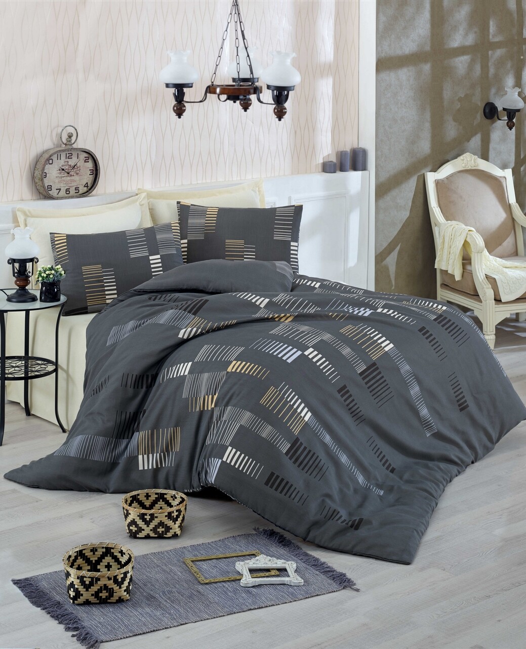 Lenjerie de pat dubla, Eponj Home, Trace Anthracite, 4 piese, amestec bumbac, antracit
