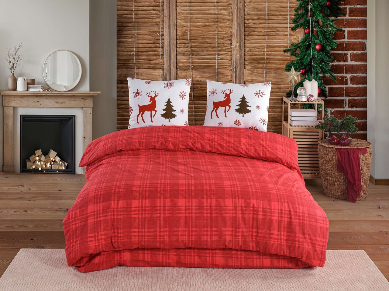 Lenjerie de pat dubla King (FR), 3 piese, L'essentiel Maison, Caspara, Roșu / Alb / Bej închis