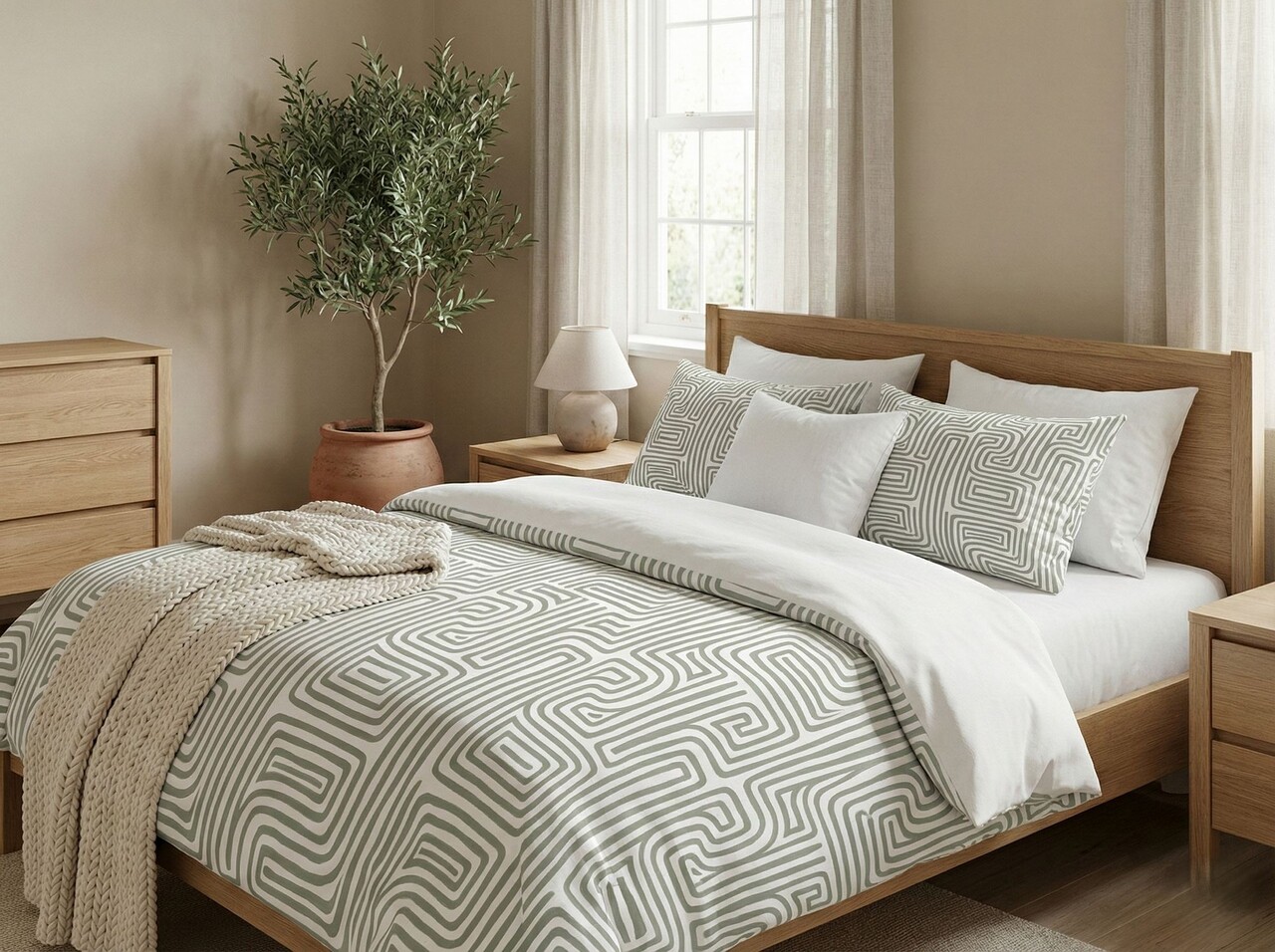 Lenjerie de pat dubla King (FR), 3 piese, L'essentiel Maison, Maze, Bumbac;Poliester, Salvie / Alb