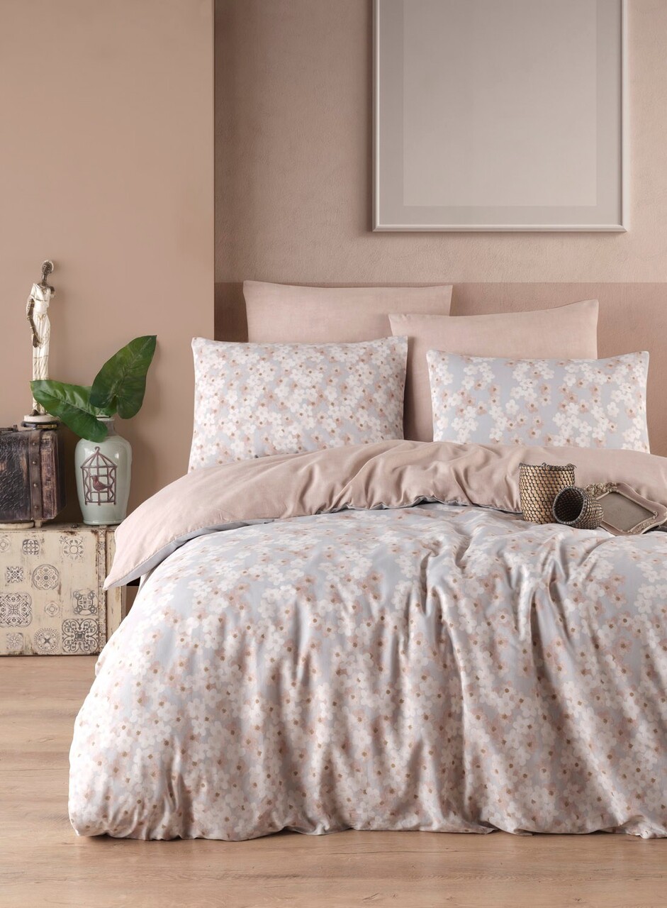 Lenjerie de pat dubla King (FR), 3 piese, L'essentiel Maison, Piti Yaprak, 65% bumbac/35% poliester, Roz prafuit