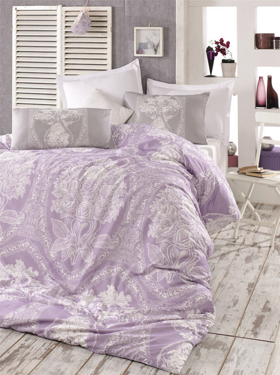 Lenjerie de pat dubla King (FR), L'essentiel Maison, Madam Lili, Liliac / Alb / Gri