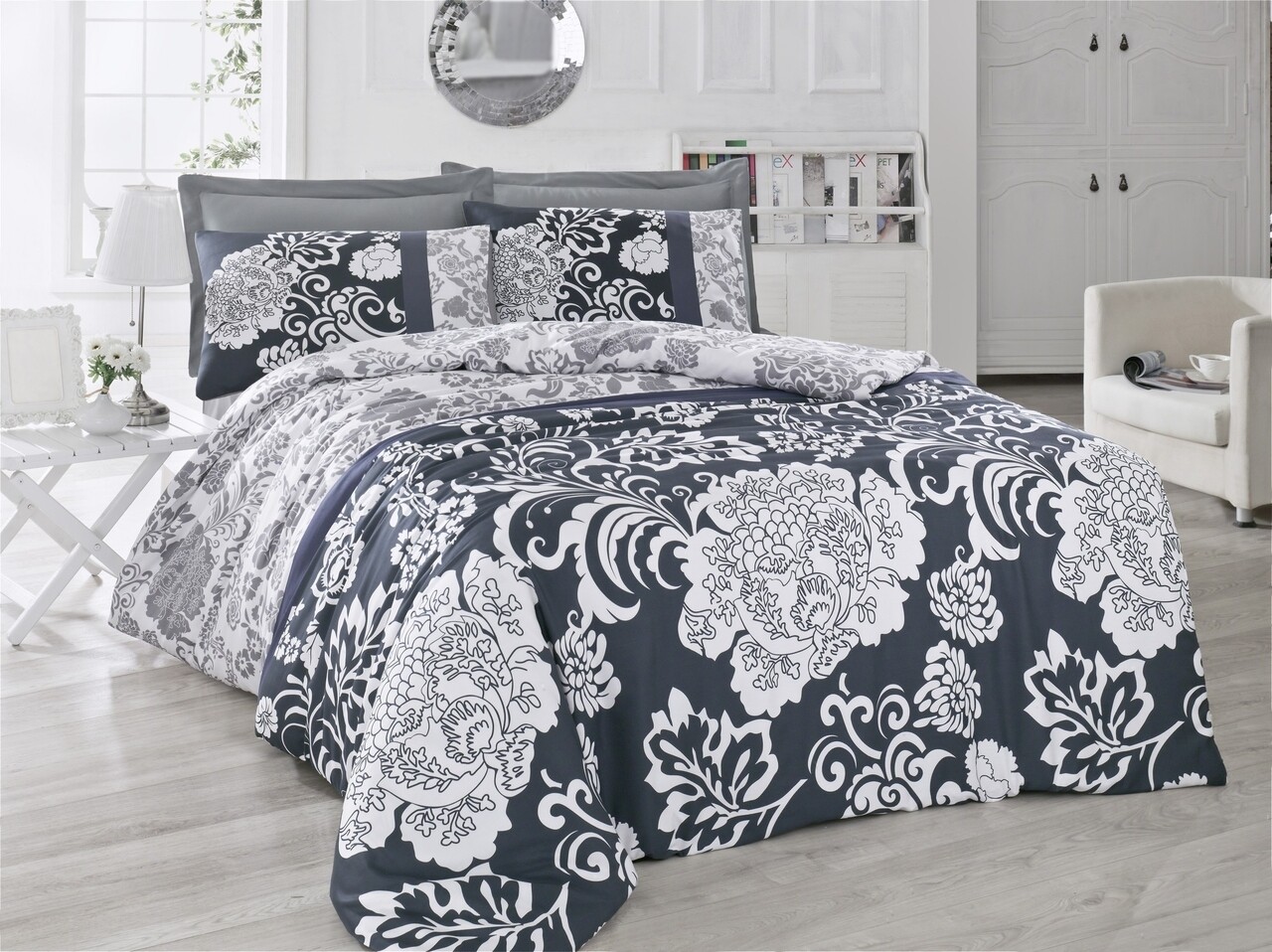Lenjerie de pat dubla King Size, Victoria, Crista, 6 piese, 240x260 cm, 100% bumbac satinat, alb/gri