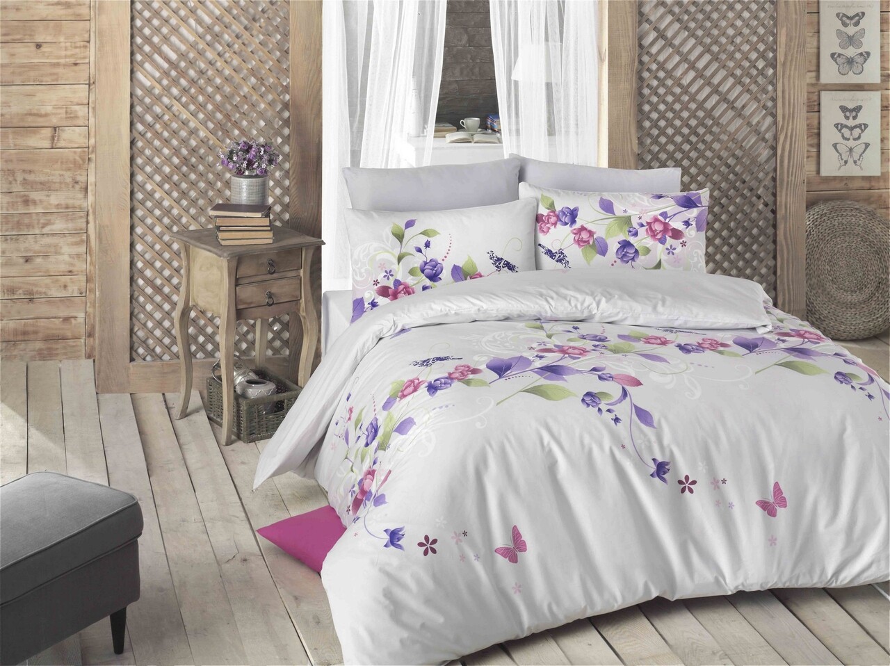 Lenjerie de pat dubla King Size, Victoria, Scalie, 4 piese, 100% bumbac ranforce, alb/mov