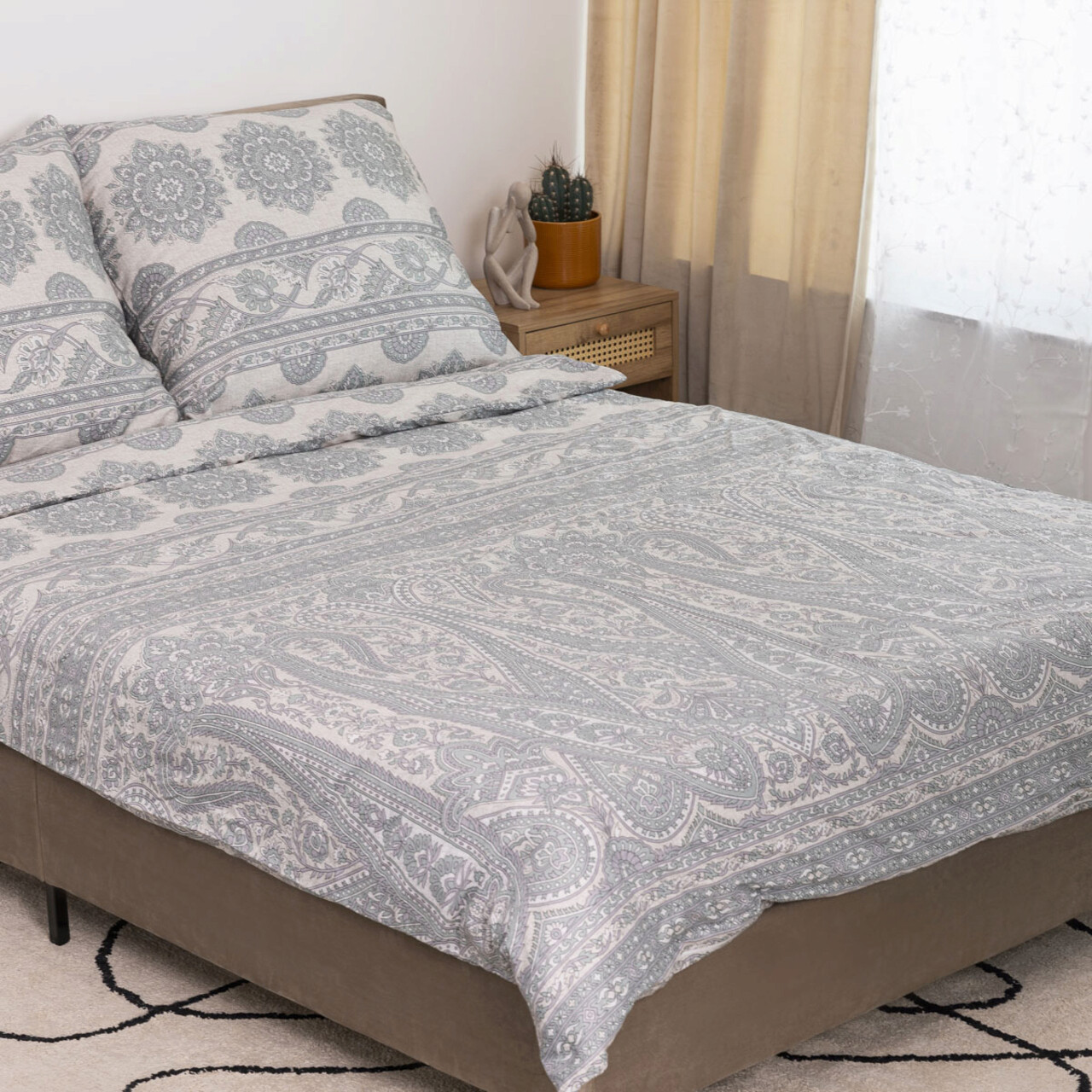 Setul MOTIFS este format dintr-o husa de pilota cu dimensiunea 160x200 cm si doua fete de perna cu dimensiunea 70x80 cm.
