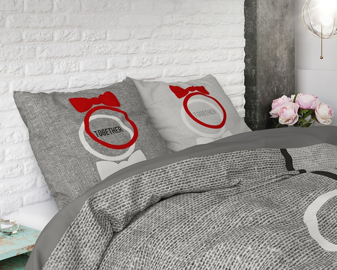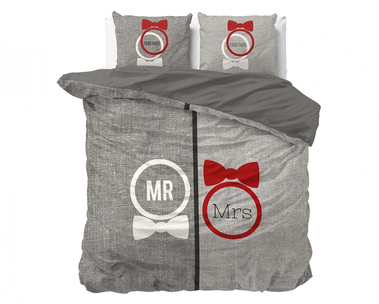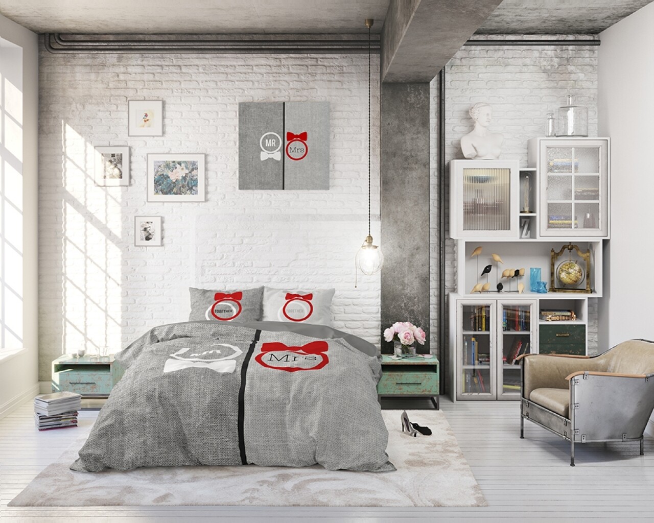 Lenjerie de pat dubla Mr. and Mrs. Trendy Grey, Dreamhouse, 3 piese, 100% bumbac, gri/rosu/negru