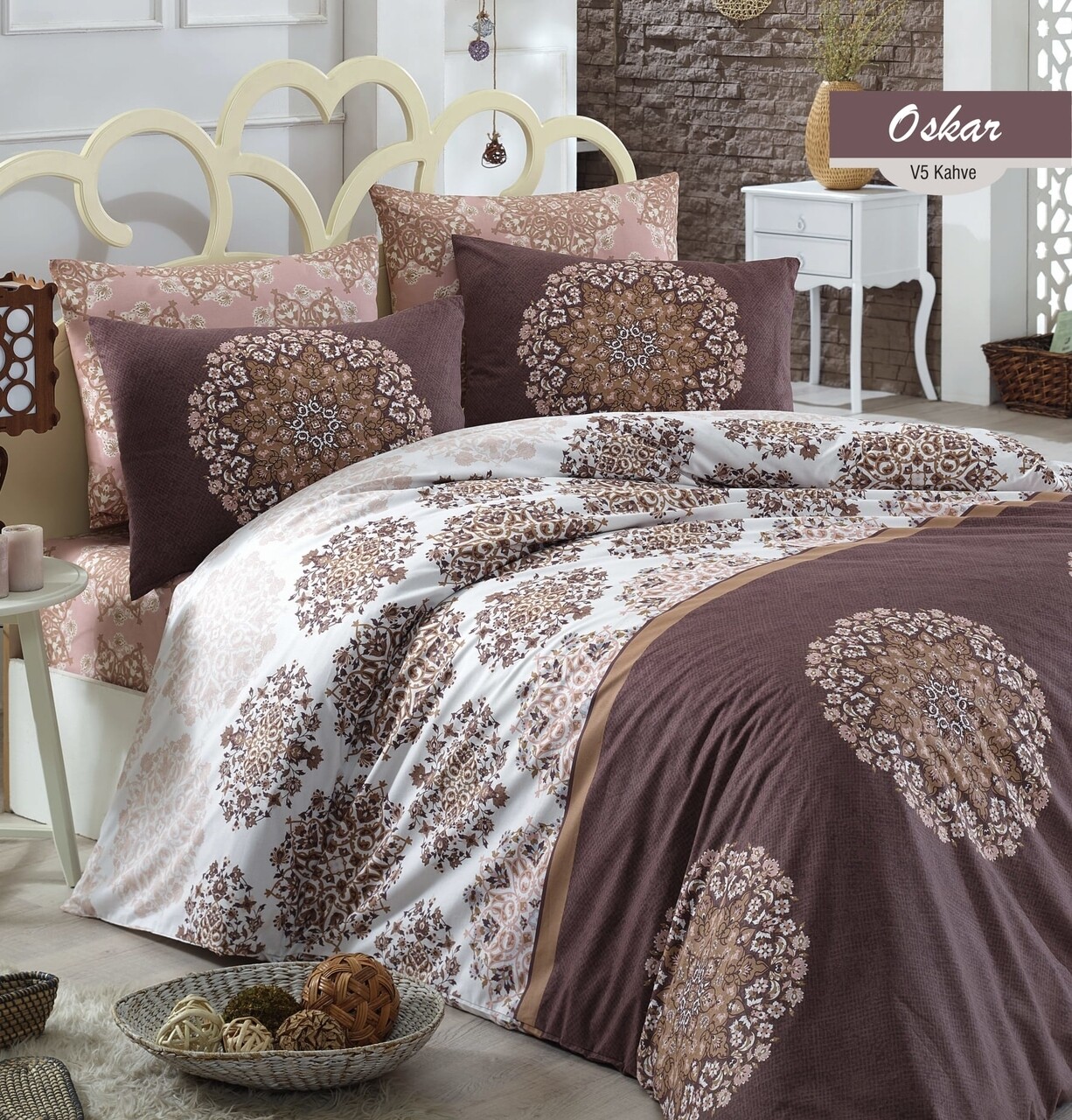 Lenjerie de pat dubla Oscar, Majoli Home Collection, 4 piese, 200x220 cm, 100% bumbac ranforce, maro