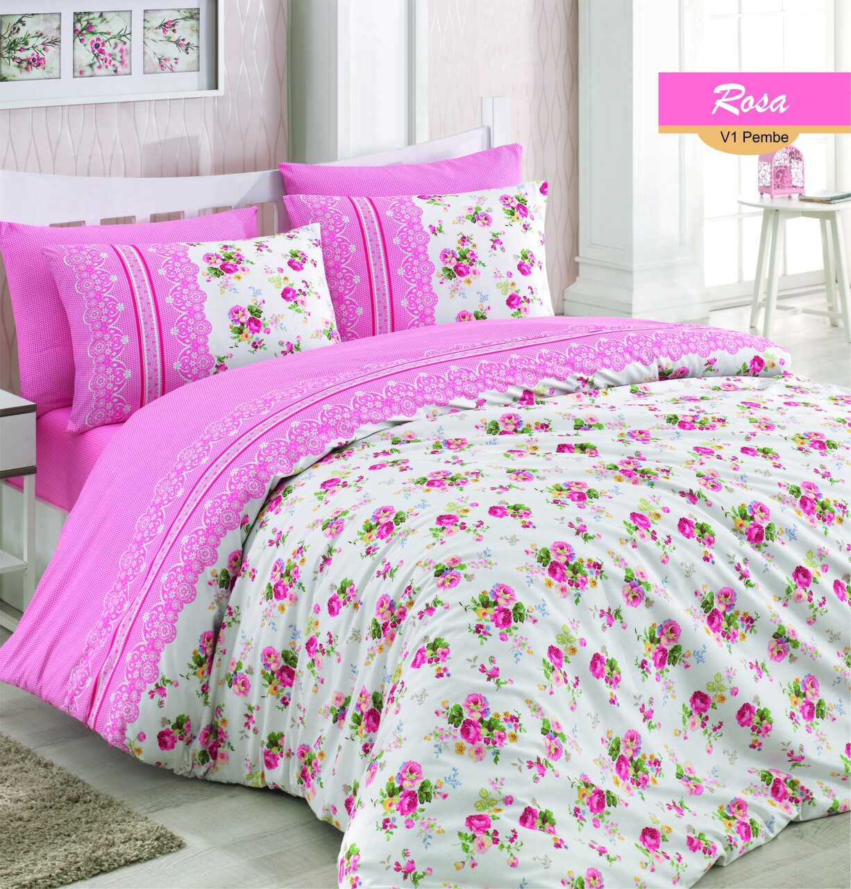 Lenjerie de pat dubla Rosa, Majoli Home Collection, 4 piese, 200x220 cm, 100% bumbac ranforce, roz