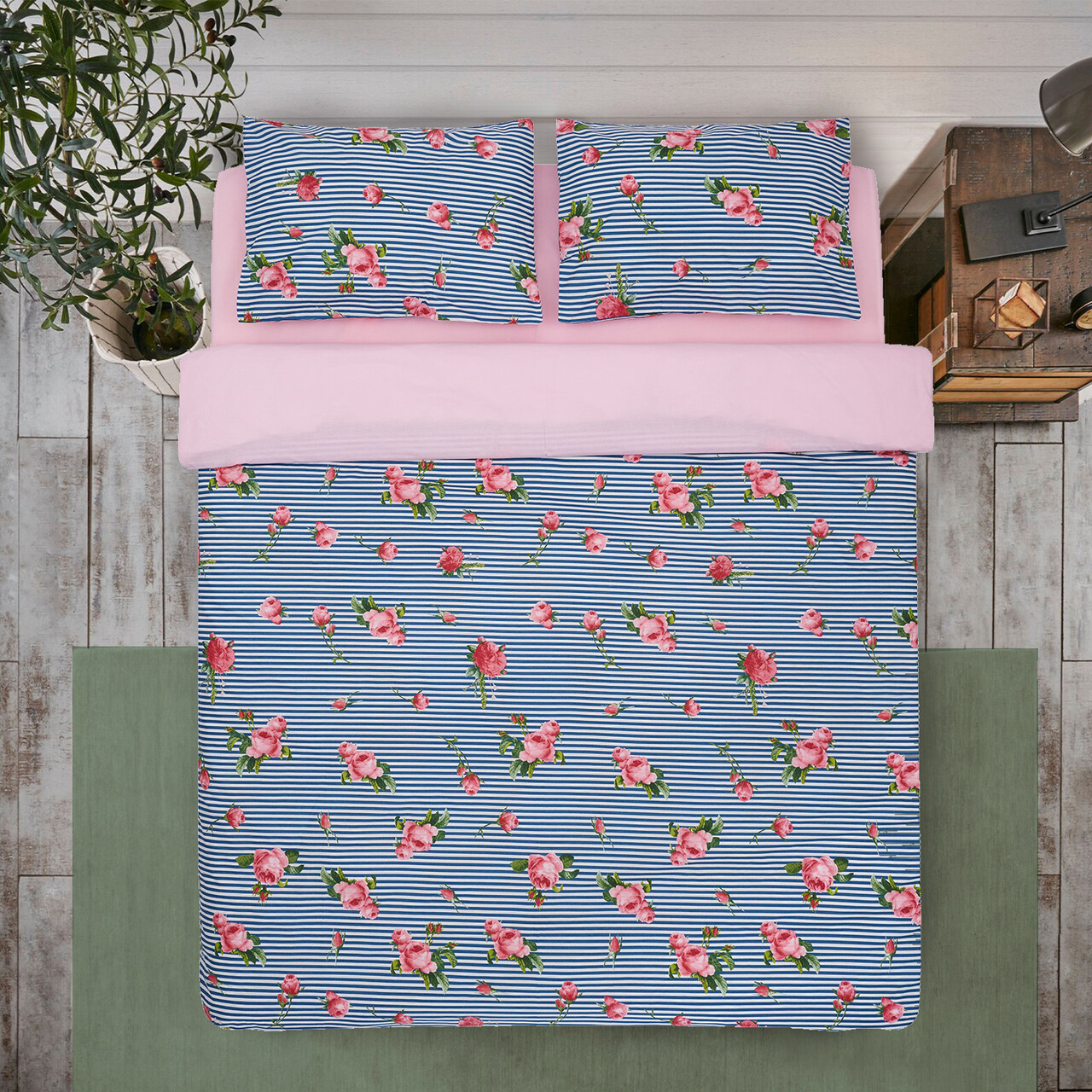 Materialul din care este realizata este 100% bumbac, acest lucru facand lenjeria de pat potrivita pentru utilizare atat in perioada mai rece cat si in cea calda. Densitate material: 132TC.