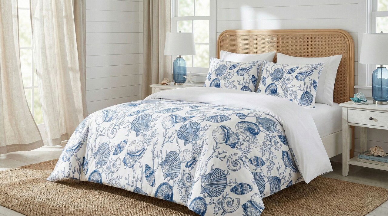 Lenjerie de pat dubla Super King (EU) (IT), 3 piese, L'essentiel Maison, Seashelly, Bumbac;Poliester, Albastru/Alb