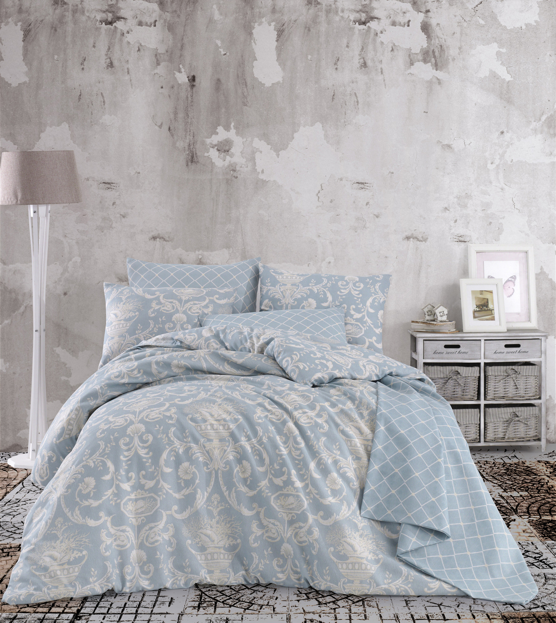 Lenjerie de pat dubla Super King (EU) (IT), 3 piese, L'essentiel Maison, Tuval, 65% bumbac/35% poliester, Albastru / Crem