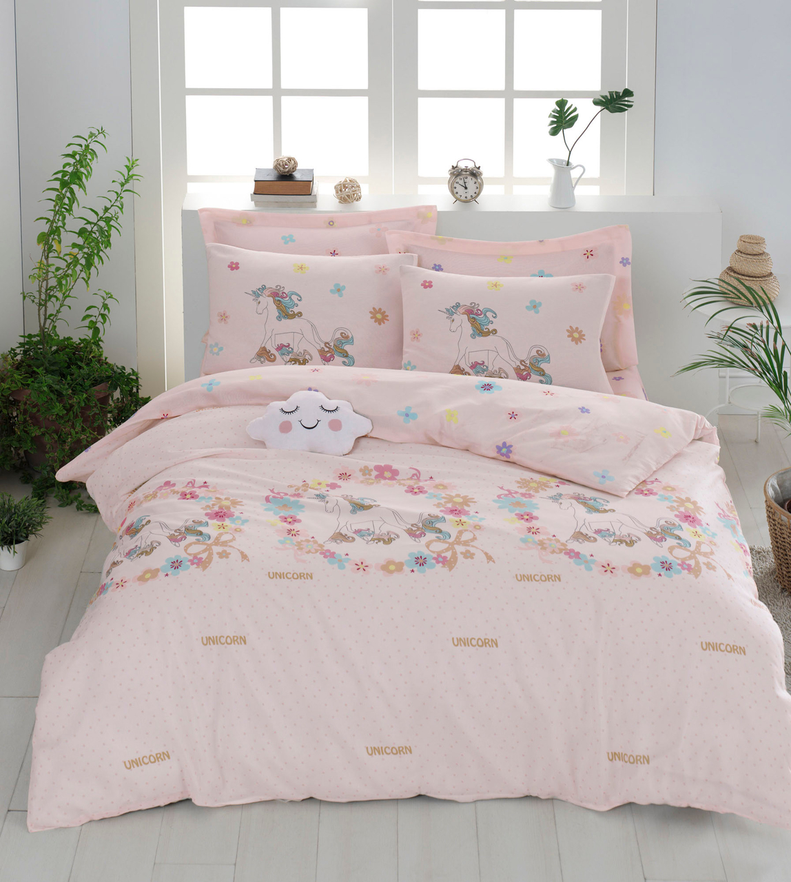 Lenjerie de pat dubla Super King (FR), 3 piese, L'essentiel Maison, Unicornlar, 65% bumbac/35% poliester, Roz / Bej