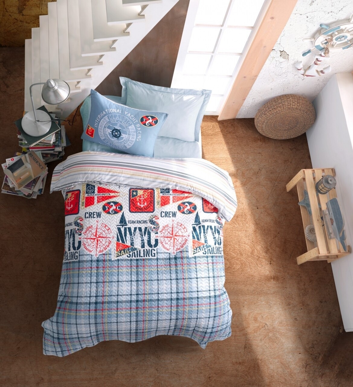 Lenjerie de pat matlasata pentru o persoana Young, 3 piese, 100% bumbac ranforce, Cotton Box, Cruise Blue