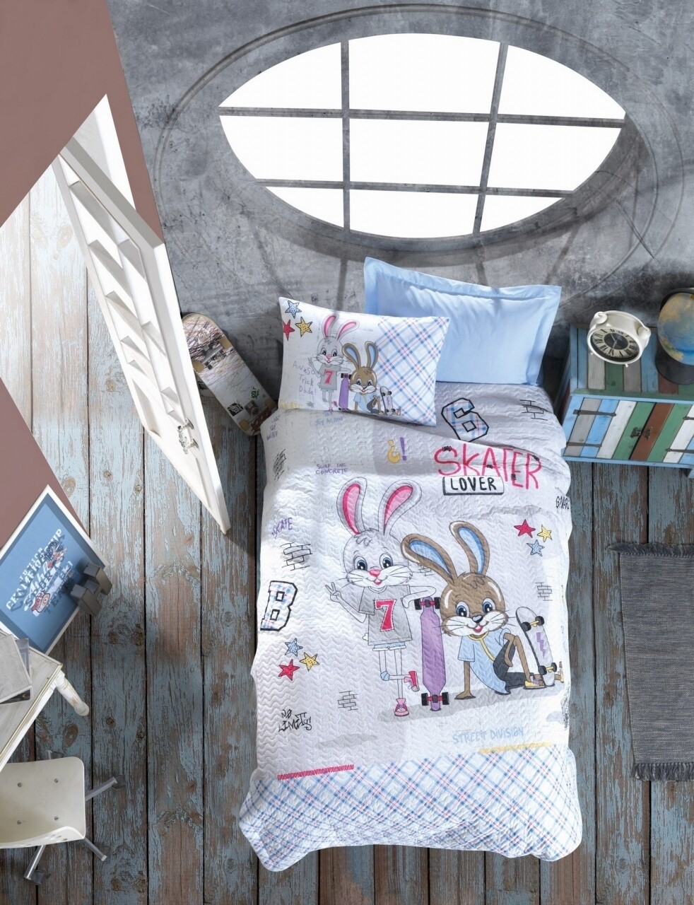 Lenjerie de pat matlasata pentru o persoana Young, 3 piese, 100% bumbac ranforce, Cotton Box, Skate Blue