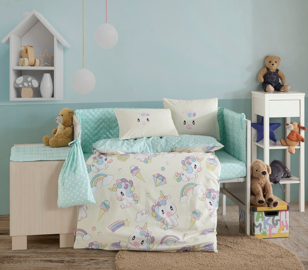 Lenjerie de pat pentru copii 4 piese, L'essentiel Maison, Mila, Crem / Mentă / Mov