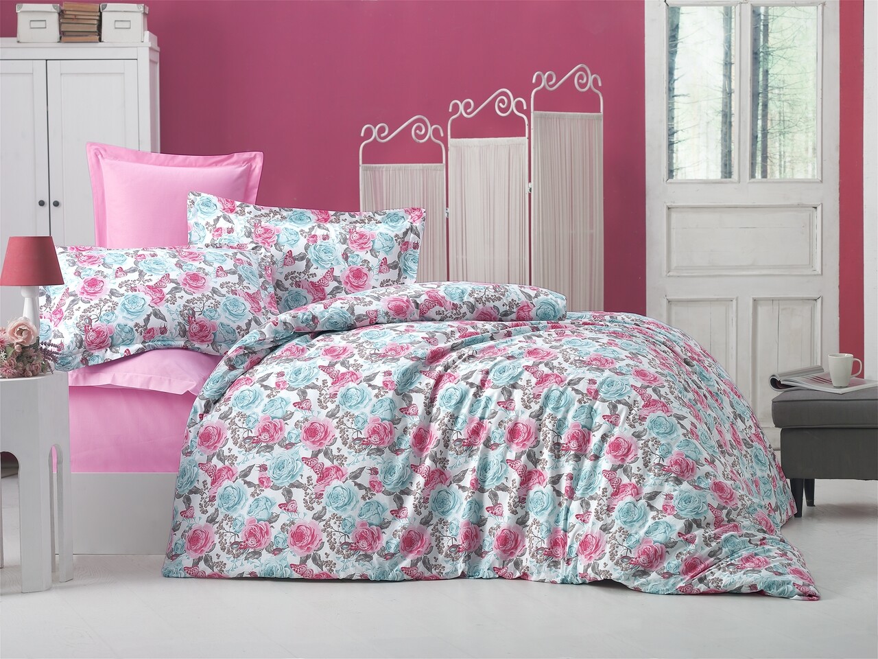 Lenjerie de pat pentru doua persoane, Blue Rose Bedora, 4 piese, 100% bumbac