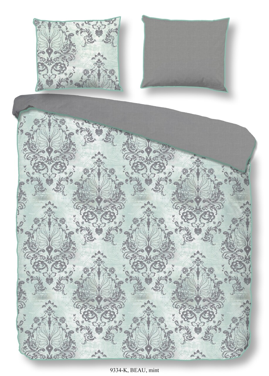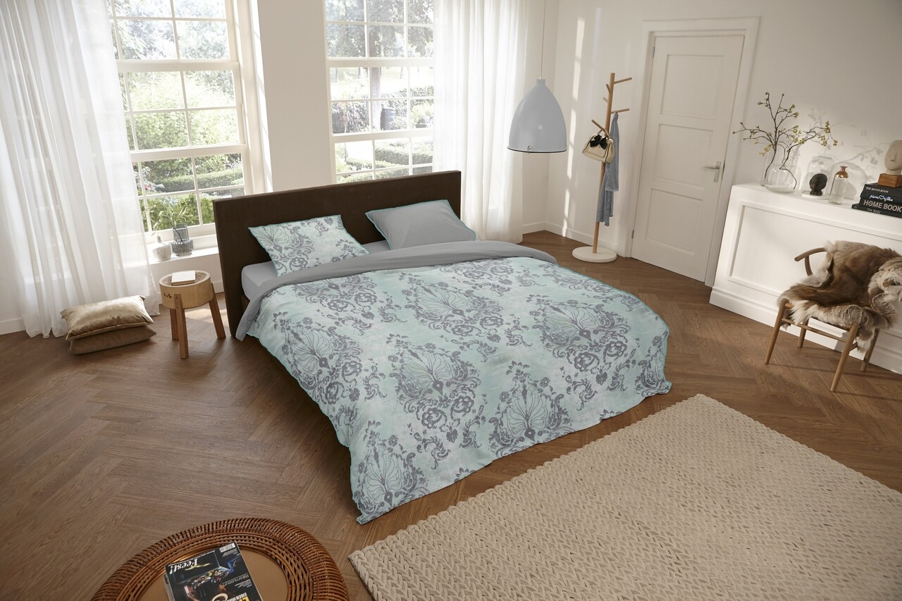 Lenjerie de pat pentru doua persoane, Descanso Beau, 100% bumbac satinat, 3 piese, gri/menta
