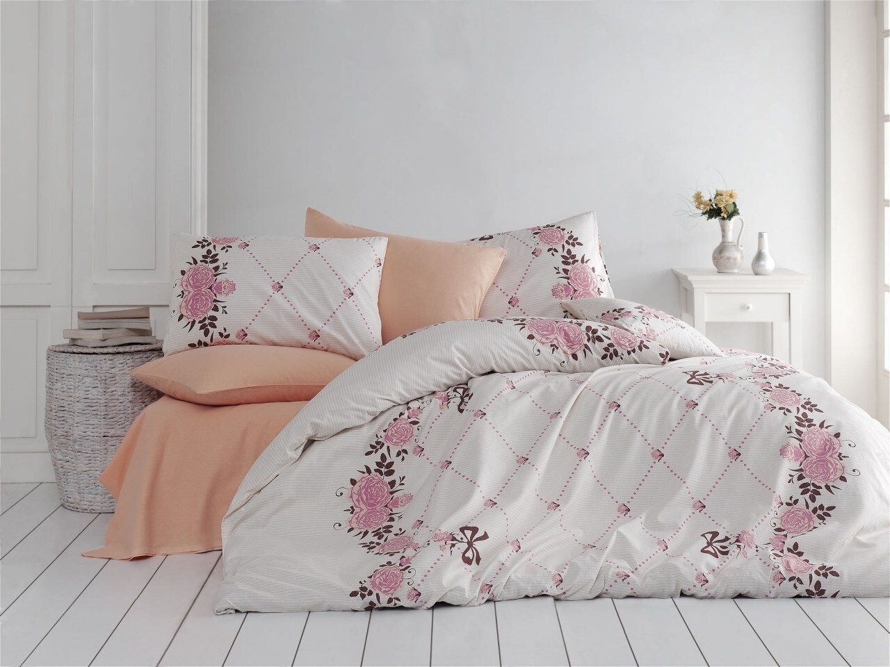 Lenjerie de pat pentru o persoana, 3 piese, 100% bumbac ranforce, Nazenin Home, Juilet, somon