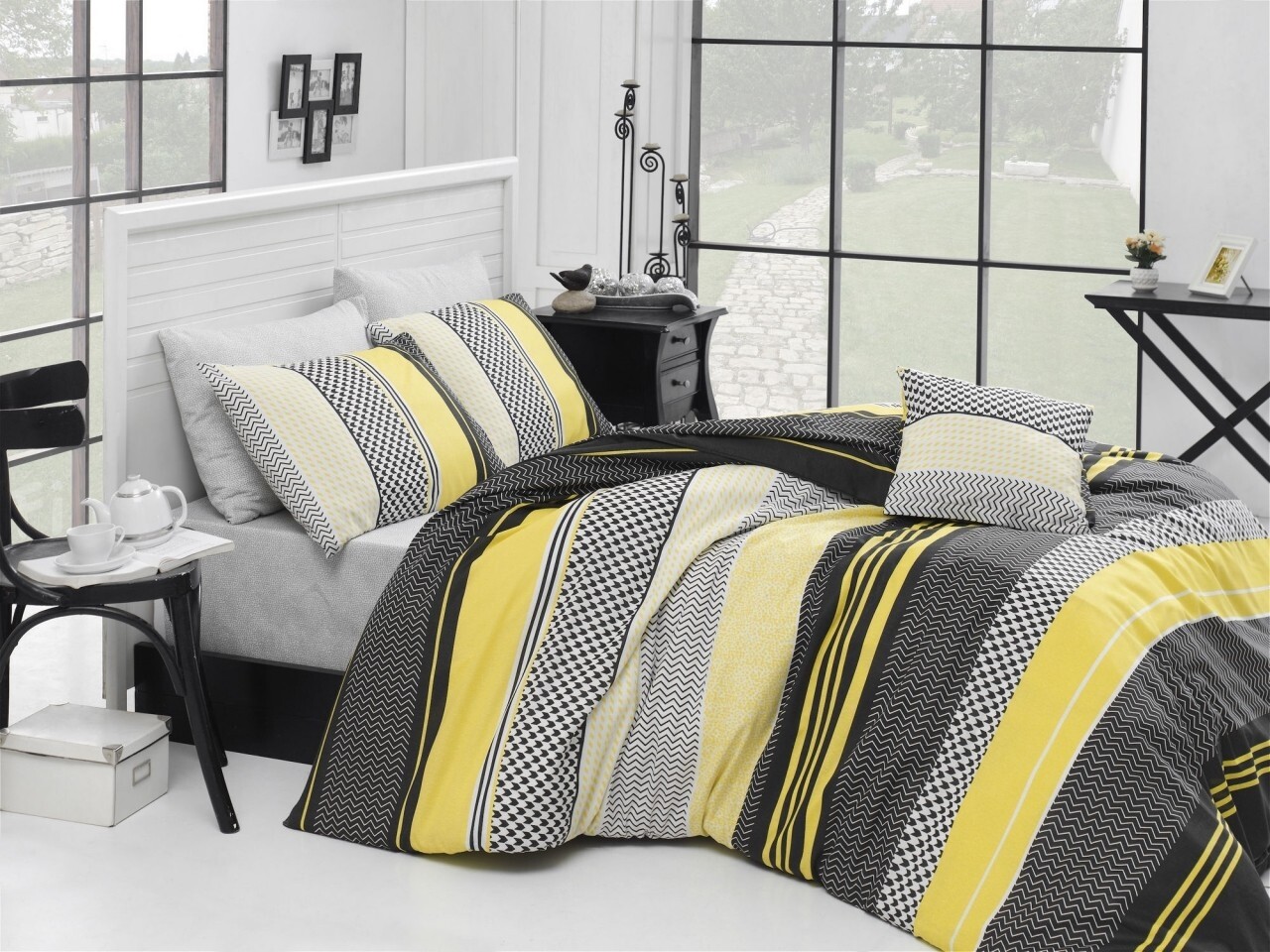 Lenjerie de pat pentru o persoana, 3 piese, 100% bumbac ranforce, Nazenin Home, Zigo Yellow, gri/galben