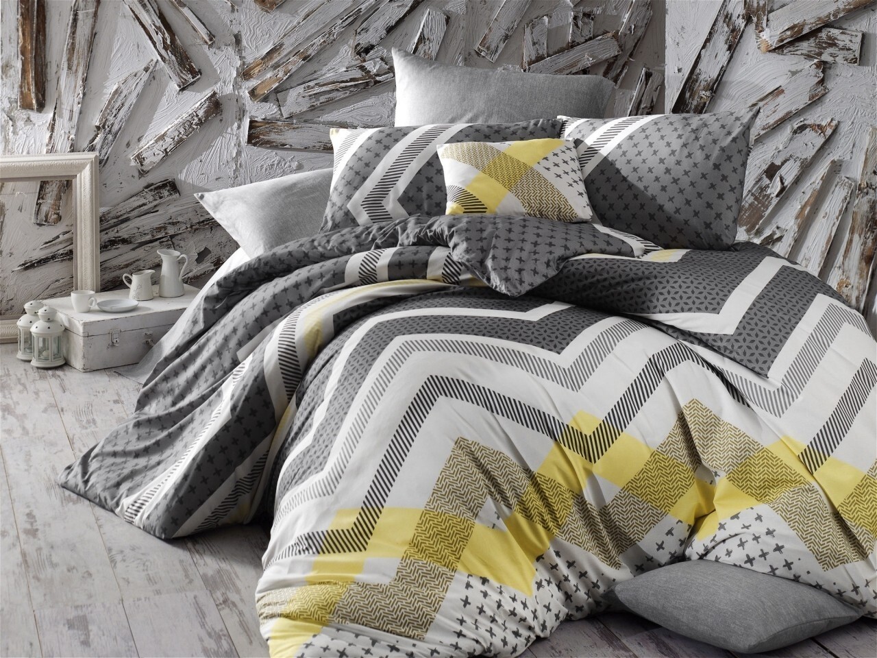 Lenjerie de pat pentru o persoana, 3 piese, amestec bumbac, Nazenin Home, Kerry Grey, alb/gri/galben