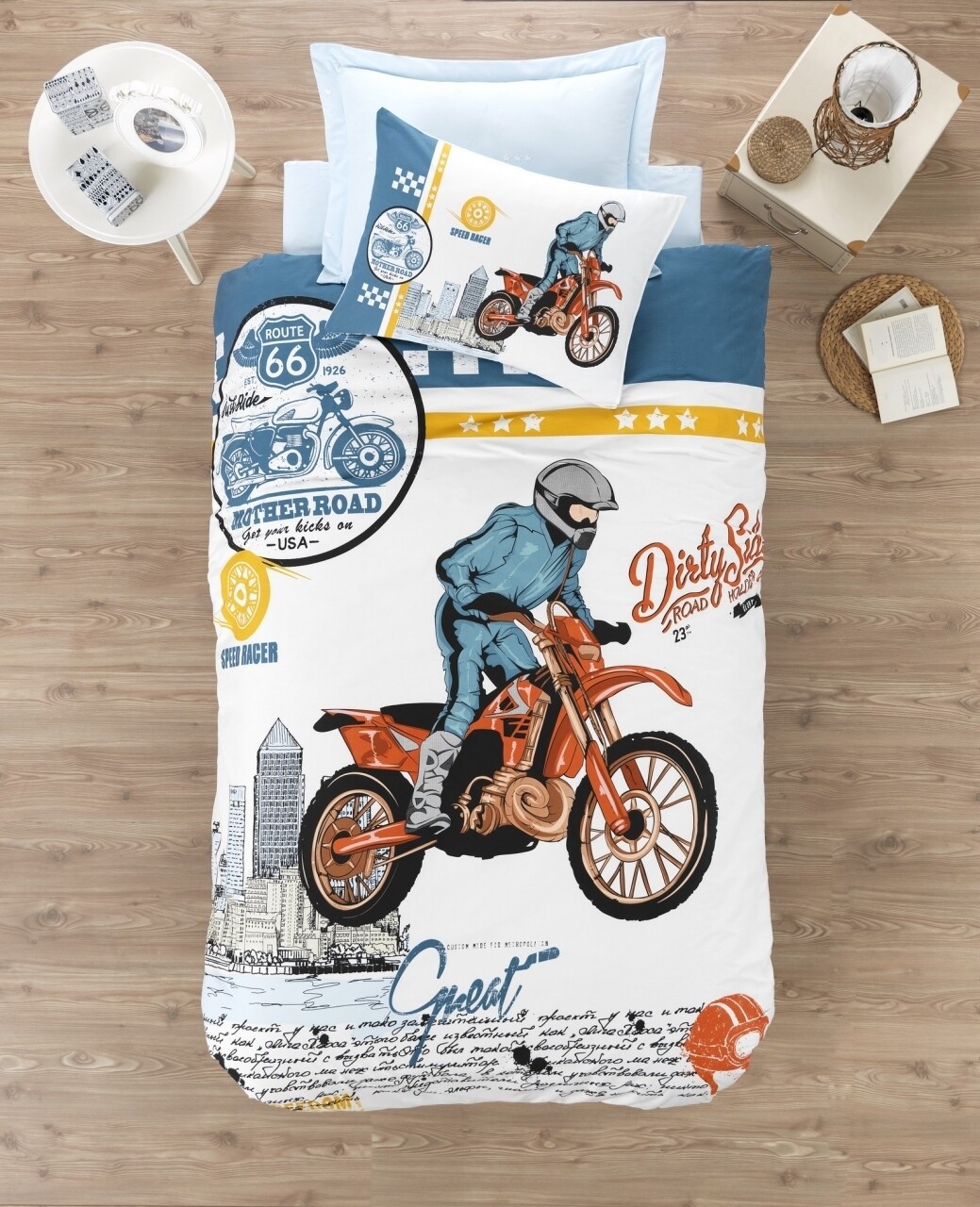 Lenjeria de pat pentru copii Cross are un imprimeu dinamic, colorat si este realizata din fibre naturale care o fac placuta la atingere. Bumbacul este cel mai indicat material pentru a intrat in contact cu pielea copiilor datorita faptului ca permite aerului sa circule si nu favorizeaza aparitia transpiratiei si a supraincalzirii.