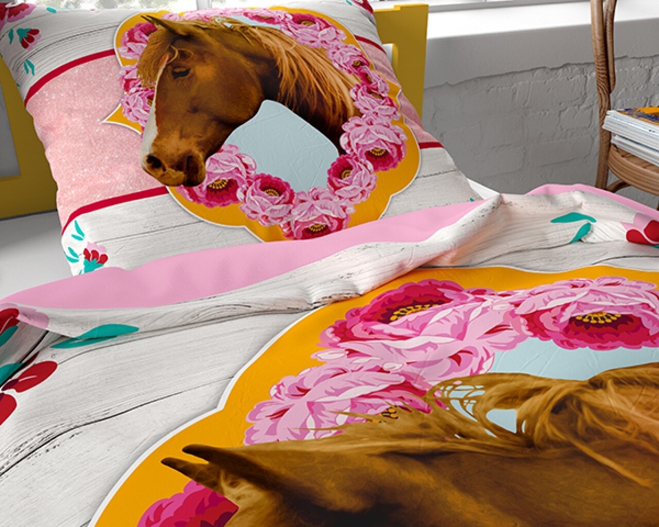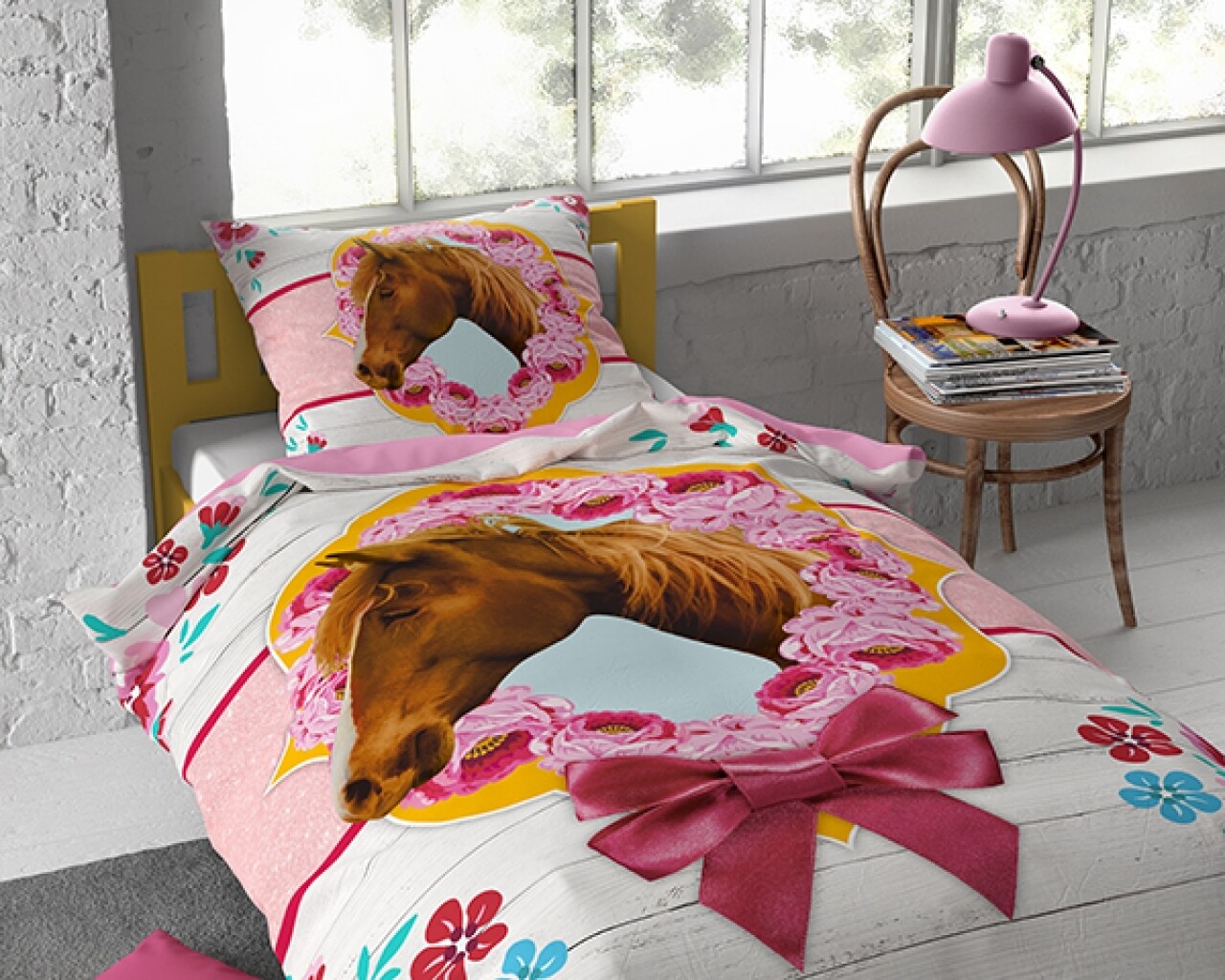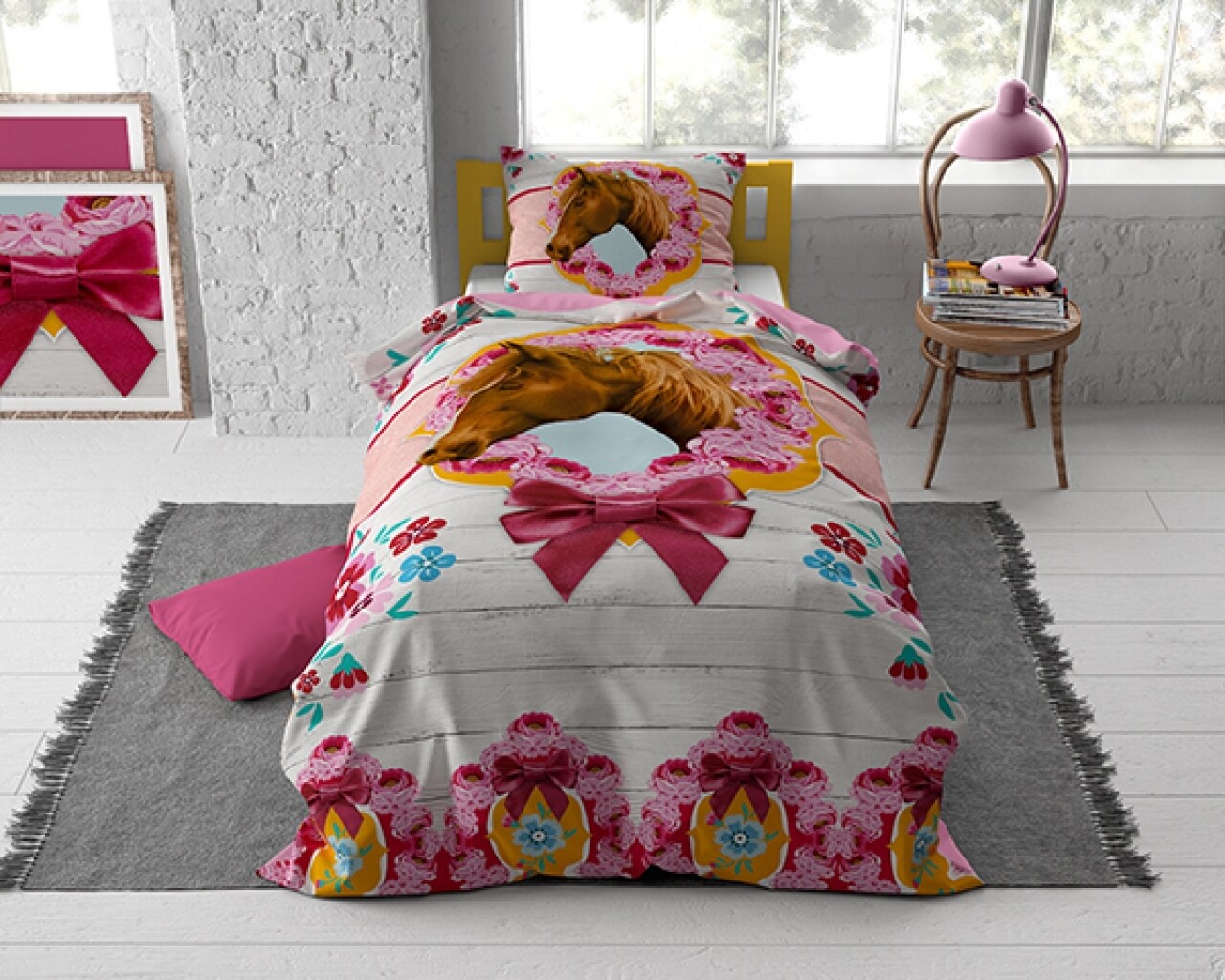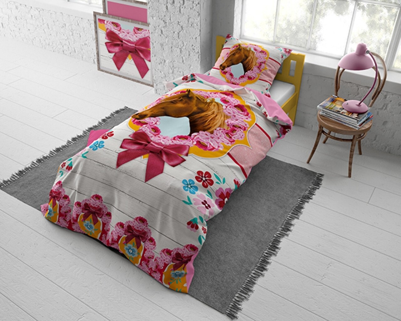 Lenjerie de pat pentru o persoana, Cute Horse Pink, Dreamhouse, 2 piese, 140x200 cm, 100% bumbac, multicolora