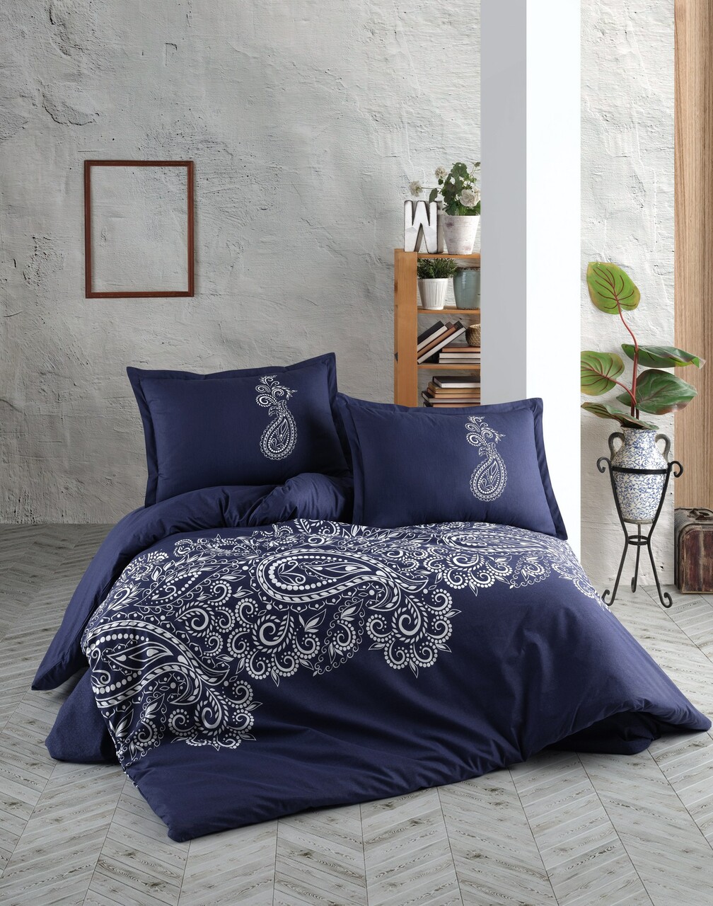 Lenjerie de pat pentru o persoana (FR), L'essentiel Maison, Nilla v1, Bumbac Ranforce, Albastru inchis