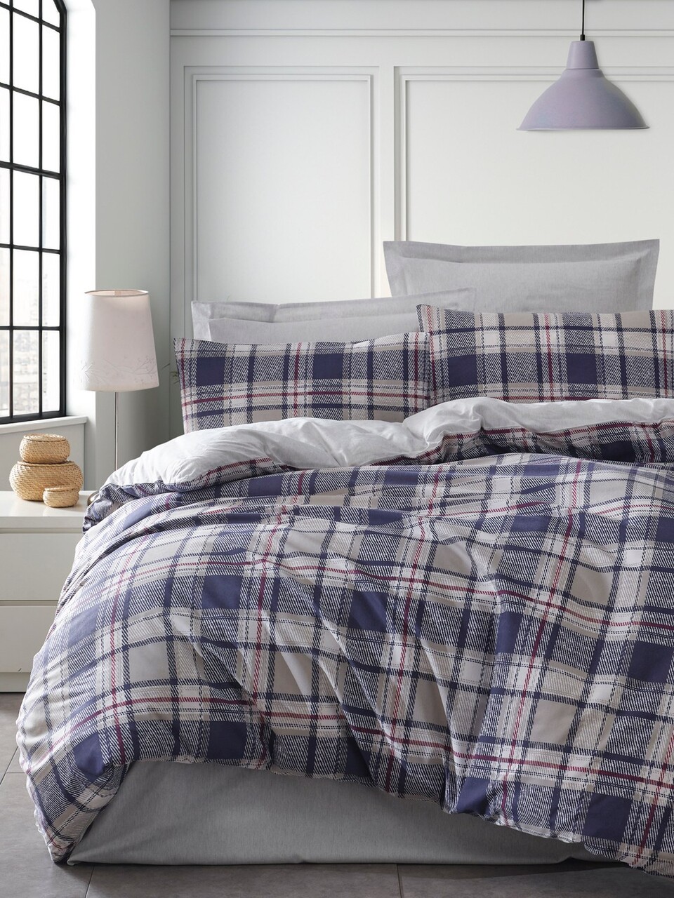 Lenjerie de pat pentru o persoana, L'essentiel Maison, Ekose, 65% bumbac/35% poliester, Albastru inchis