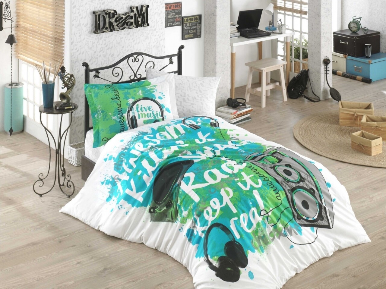 Lenjerie de pat pentru o persoana, Live Music Green, Hobby, 3 piese, 160 x 240 cm, 100% bumbac poplin, verde/alb