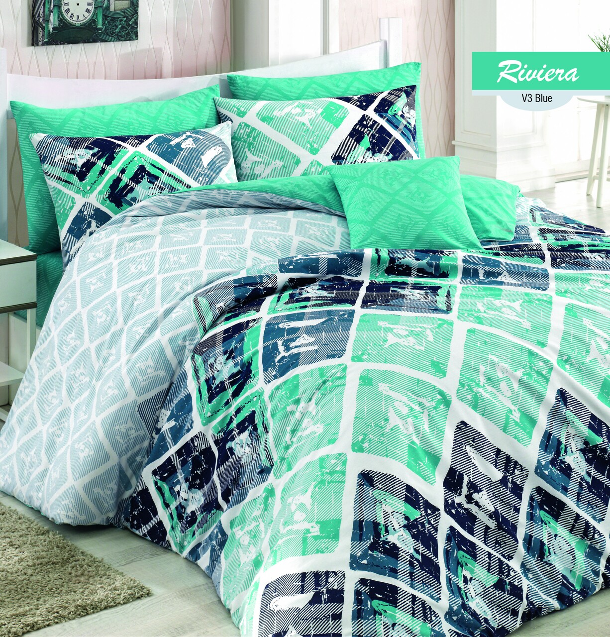 Lenjerie de pat pentru o persoana Riviera, Majoli Home Collection, 3 piese, 160x240 cm, 100% bumbac ranforce, multicolor