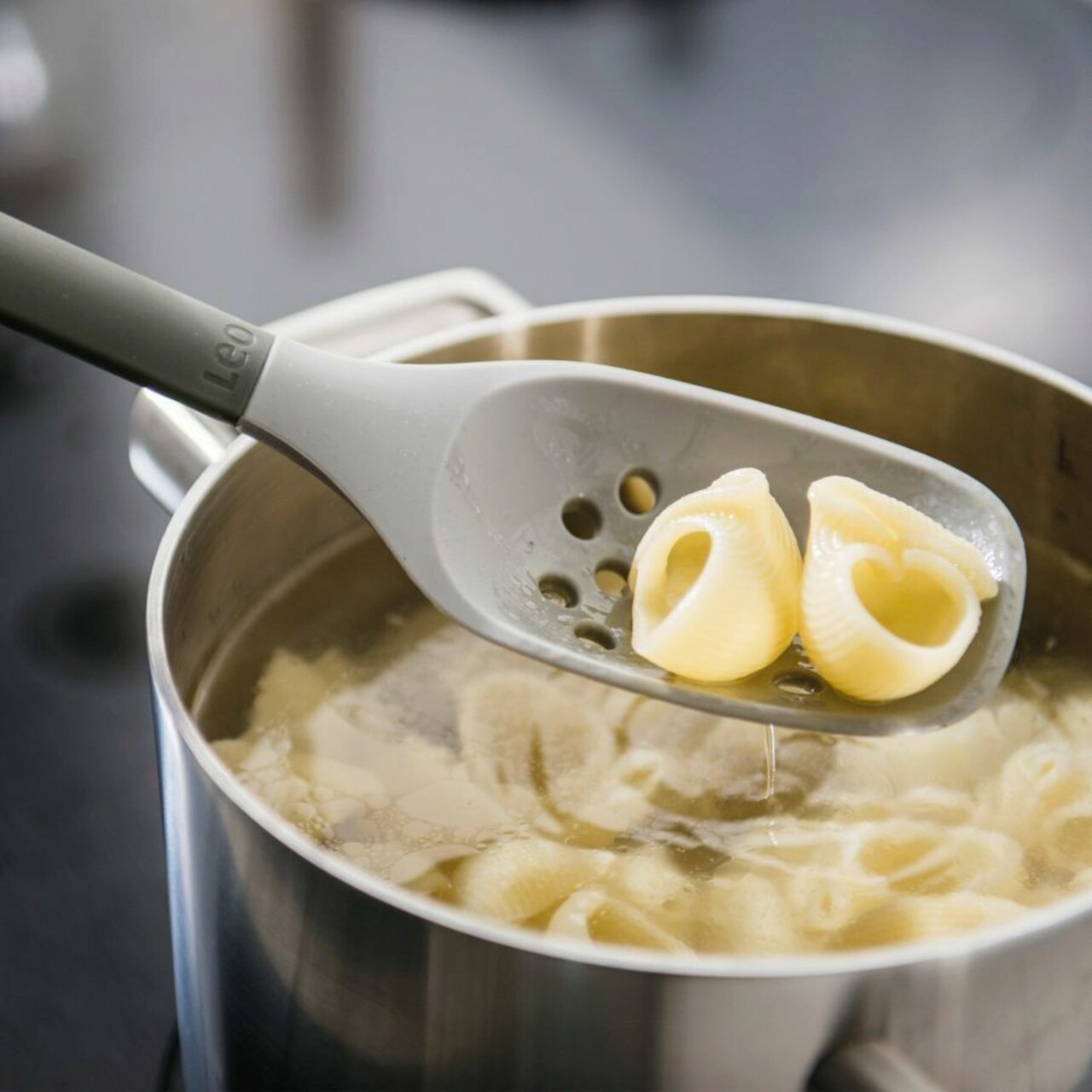 De la paste la mazare, lingura strecuratoarea Leo cu corp din silicon este instrumentul perfect pentru a degresa si a strecura lichidul din oale si tigai fara a zgaria suprafata delicata a vaselor de gatit. Manerul din cauciuc moale la atingere asigura o prindere confortabila si are o bucla convenabila, astfel incat sa puteti agata strecuratoarea de un carlig alaturi de celelalte ustensile Leo pentru acces facil. Produs compatibil cu masina de spalat vase.