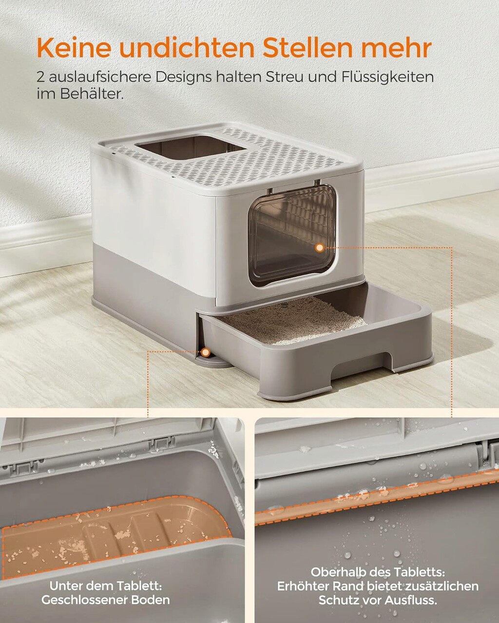 Mai putina murdarie: un grilaj in partea superioara reduce formarea urmelor si permite nisipului sa cada inapoi in cutie. Marginea extinsa deasupra cutiei si fundul inchis dedesubt previn ca nisipul sau urina pisicii sa ajunga pe podea.