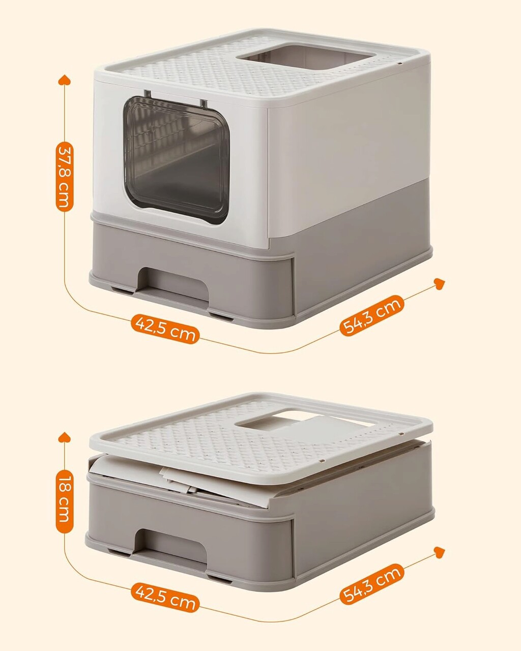 Litiera cu capac pentru pisici, Feandrea, cu 2 iesiri, 54.3 x 42.5 x 37.8 cm, max 15 kg, gri deschis