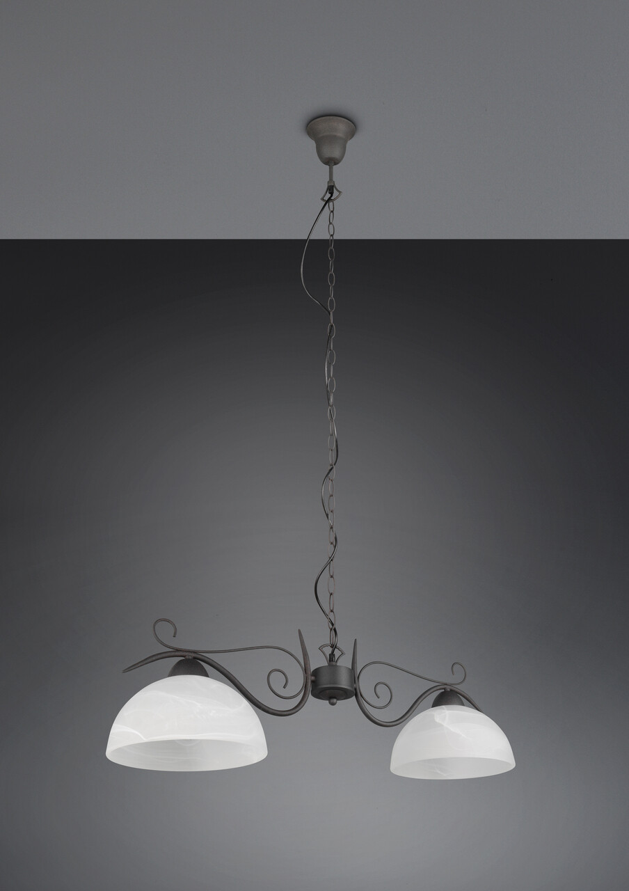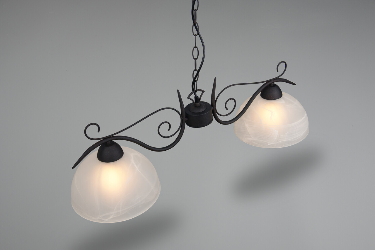 Lustra decorativa COUNTRY cu doua puncte de lumina aduce un mic fler de casa la tara in casa ta. Designul curbat o face un element decorativ frumos care poate fi combinat si cu multe stiluri de mobilier clasice. Lustra are o latime de 82 cm si o inaltime maxima de 150 cm. Designul sau si sticla in alb alabastru sporesc designul luminii si pot fi combinate cu usurinta cu interioarele existente. Pentru iluminarea cu economie de energie, se recomanda utilizarea unui iluminator LED. Acestea sunt o alternativa optima la lampile cu halogen conventionale si reprezinta o inalta calitate a luminii si economii de energie de pana la 80%. In plus, lampile cu LED va ajuta sa beneficiati de o durata lunga de viata, generare scazuta de caldura si, in acelasi timp, sa protejati mediul inconjurator.