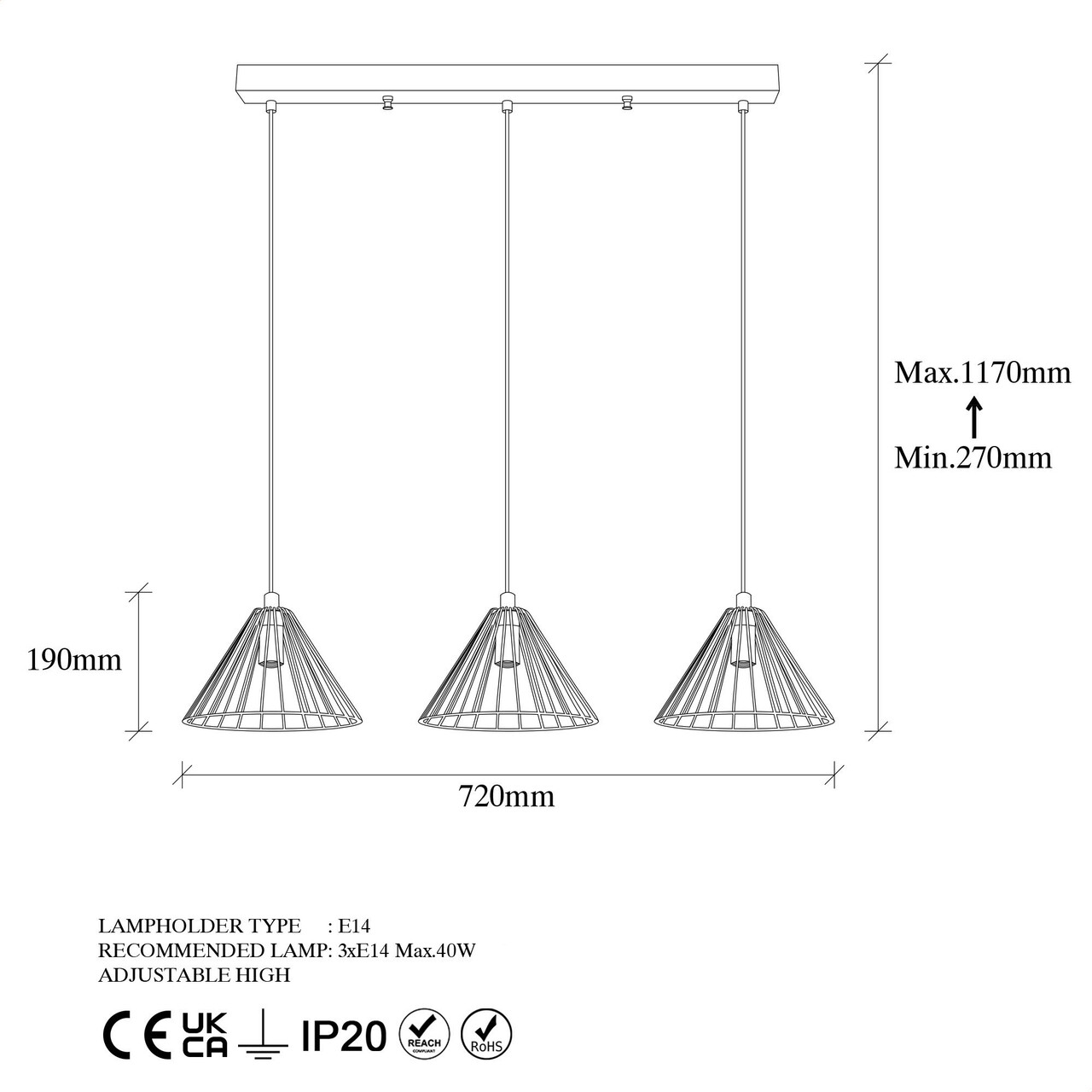 Tip soclu: 3 x E27 Max 40 W