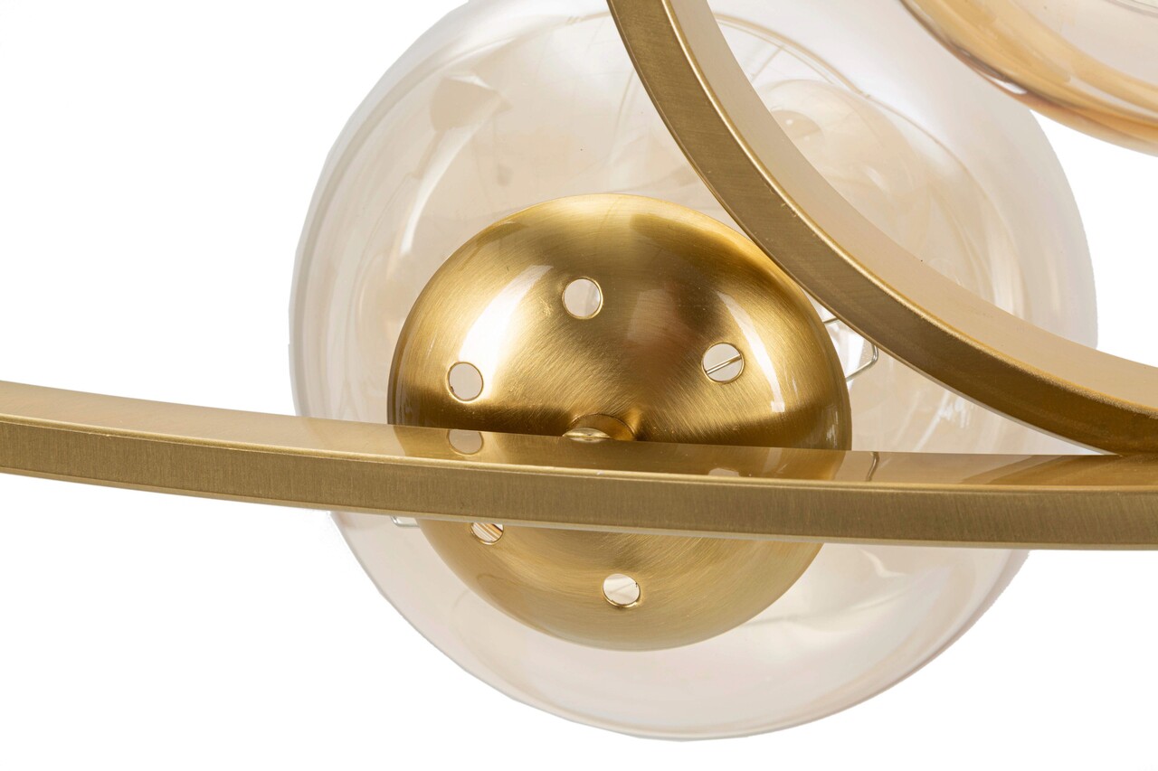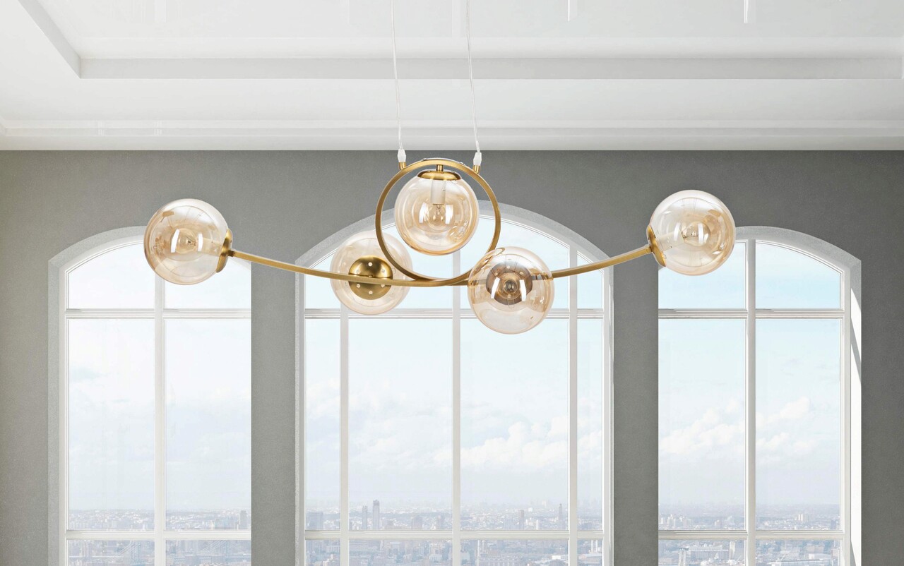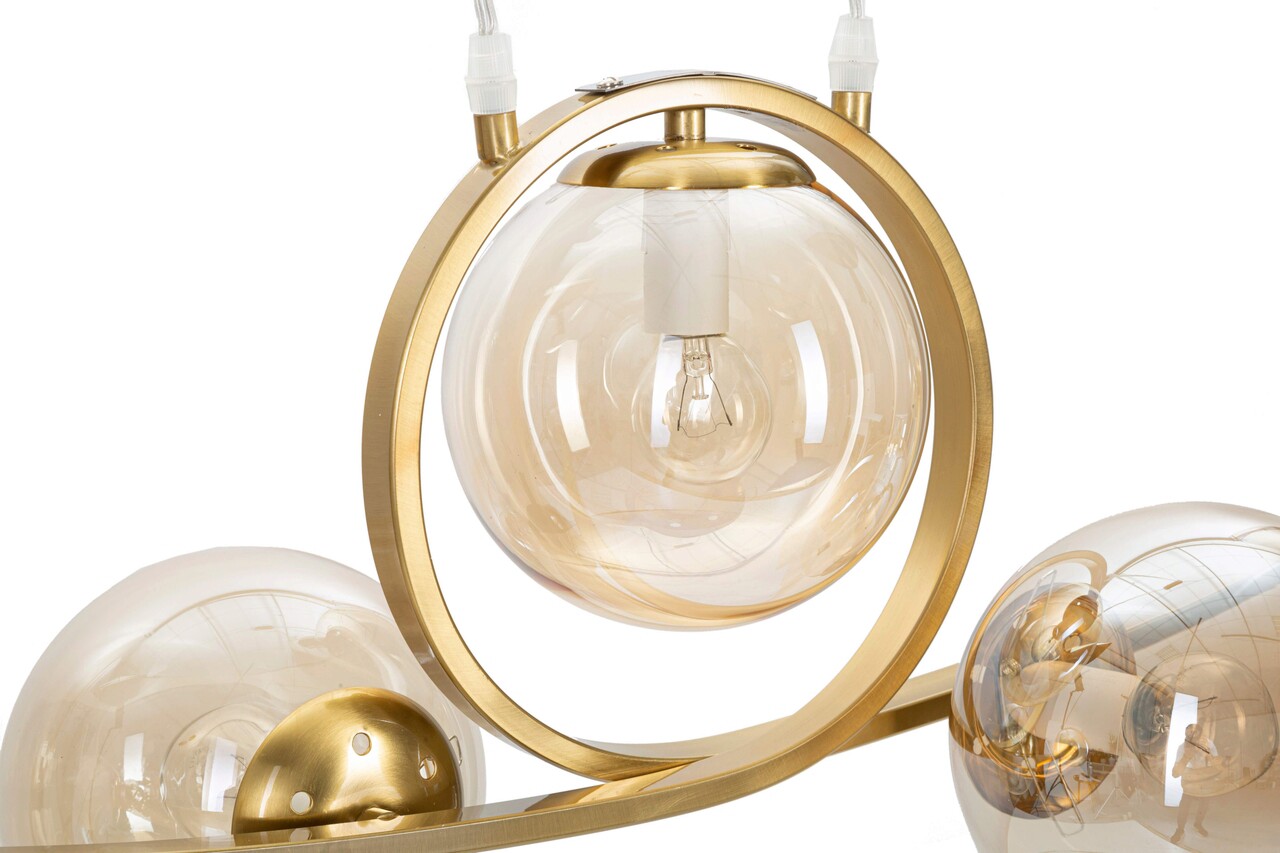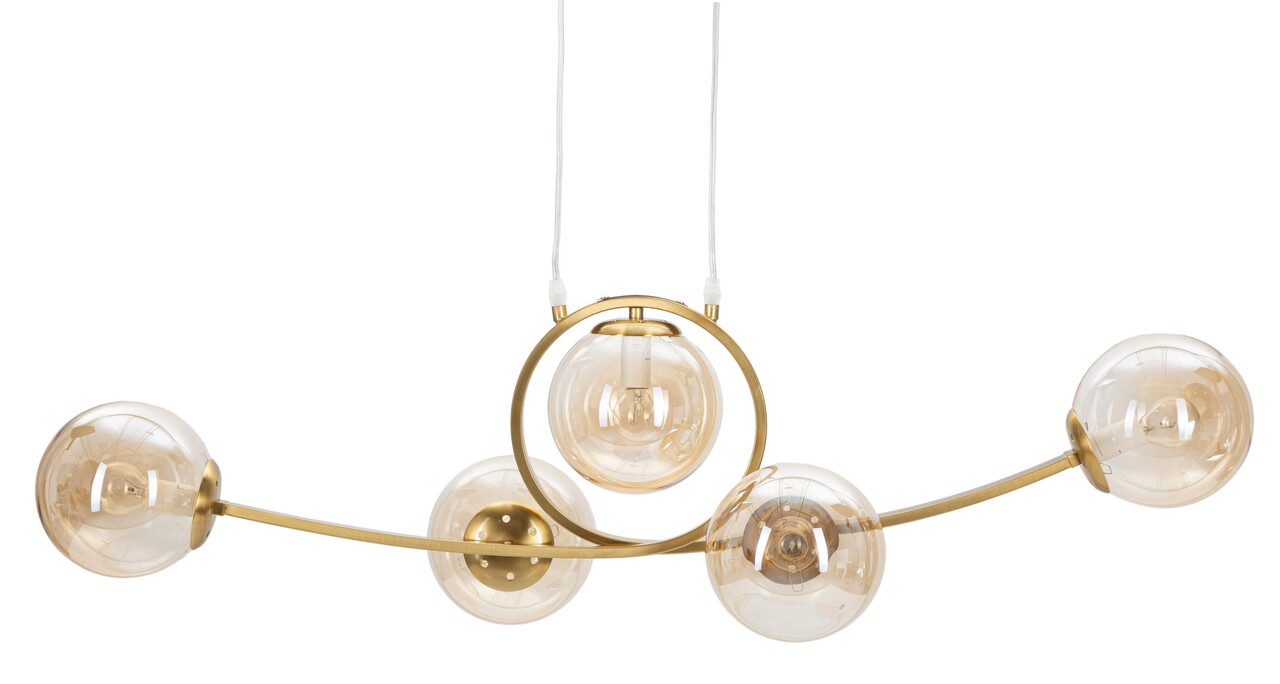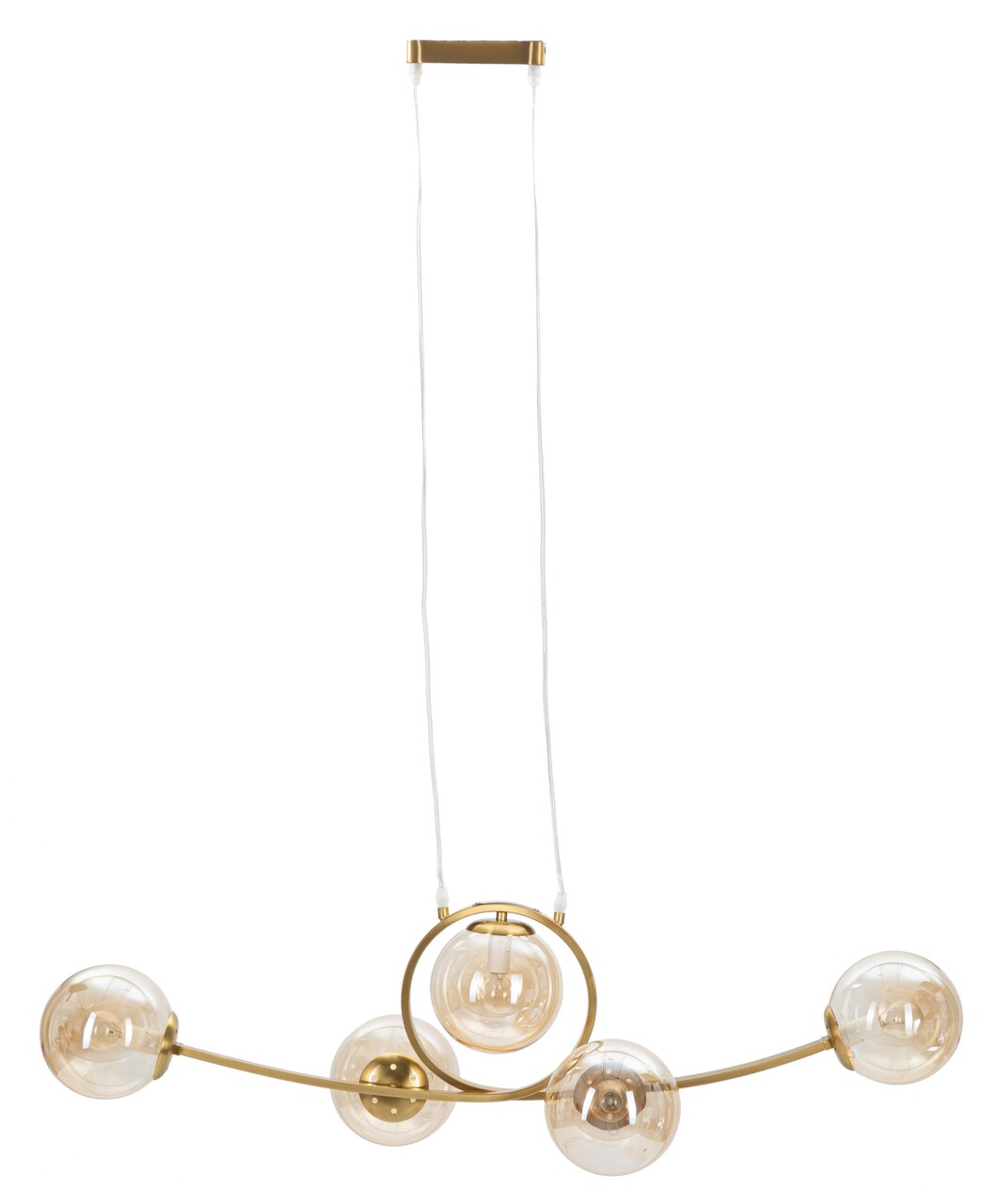 Lustra din metal auriu cu linii simple si 5 becuri in sfere elegante din sticla alba.