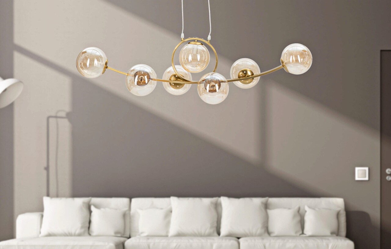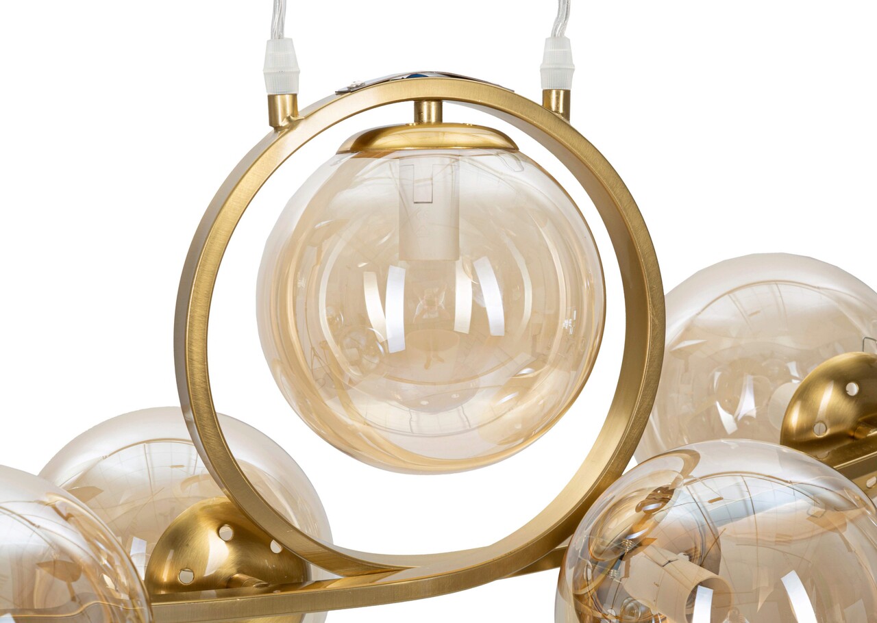 Lustra din metal auriu cu linii simple si 7 becuri in sfere elegante din sticla alba.