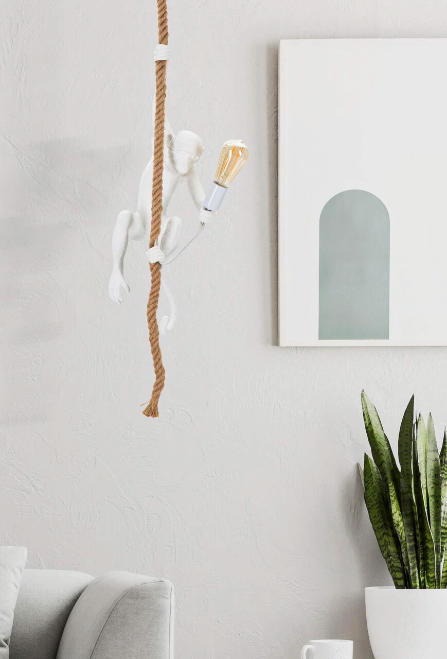 Lustra din polirasina avand forma unei maimute care se catara pe o franghie tinand becul in mana.