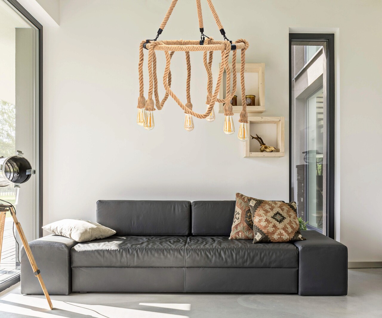 Lustra rotunda din metal si sfoara cu 6 becuri si un design simplu care aminteste de viata din casele traditionale de la tara.
