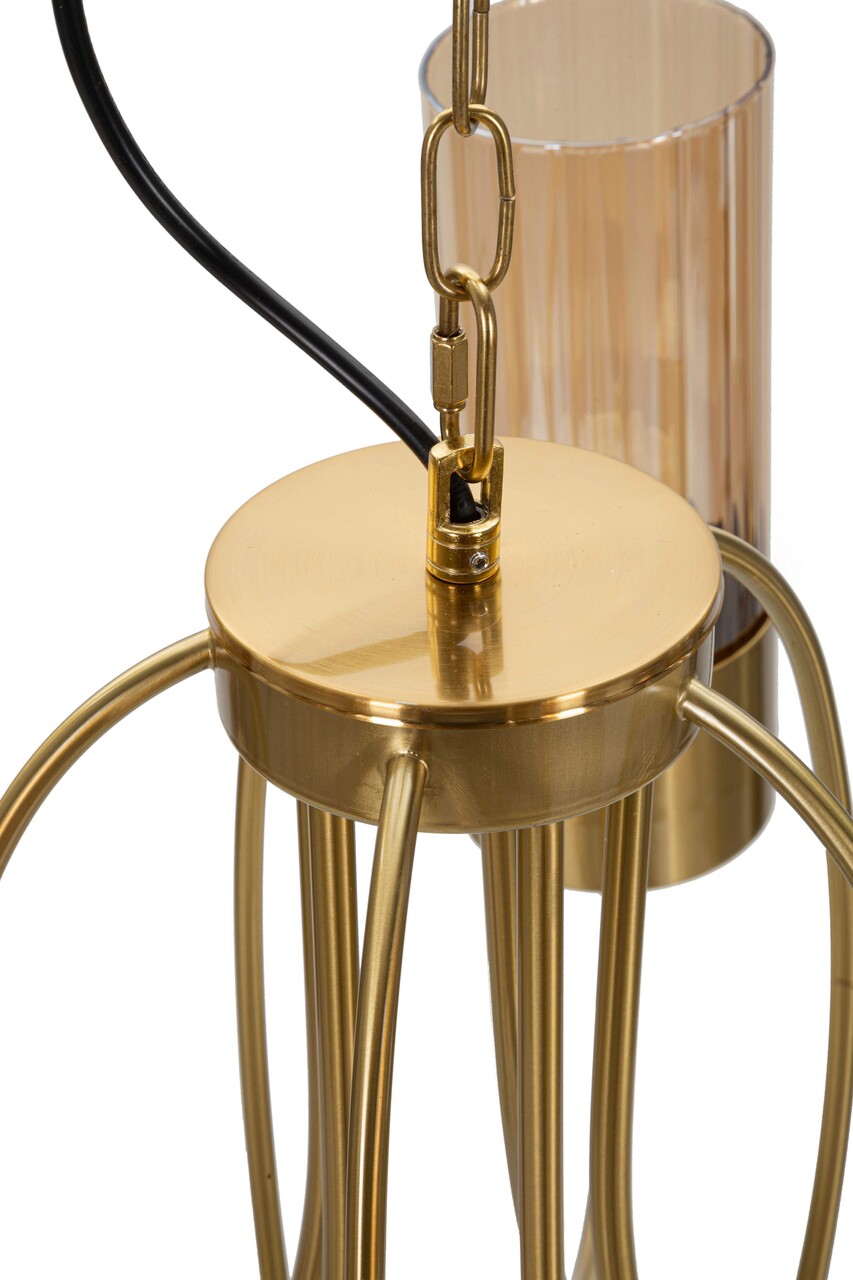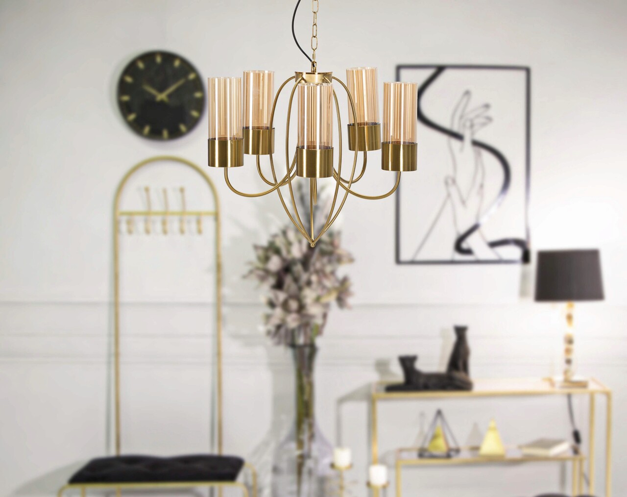 Lustra din metal auriu cu linii simple si 5 abajururi din metal auriu si sticla.