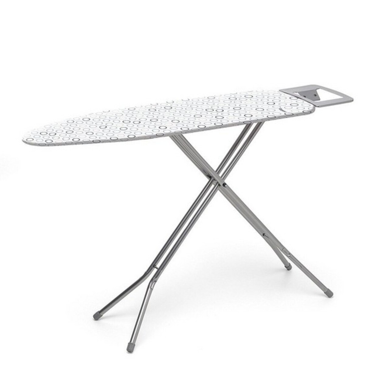 Masa de calcat cu suport pentru fier de calcat are structura din metal. Husa mesei este confectionata din bumbac si poliester. Are 7 trepte de inaltime, cea mai mare fiind de 90 cm. Picioarele au capace de cauciuc antiderapante si asigura stabilitate. Dimensiune: 113 x 34 cm (L x l).