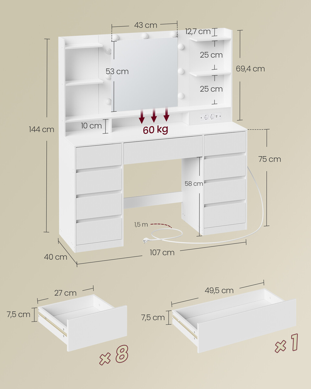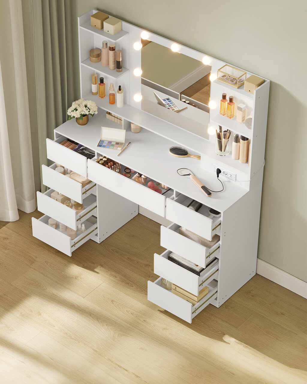 Masa dispune de un blat lat de 107 cm, 9 sertare si 8 compartimente deschise pentru organizarea eficienta a produselor de machiaj si ingrijire.