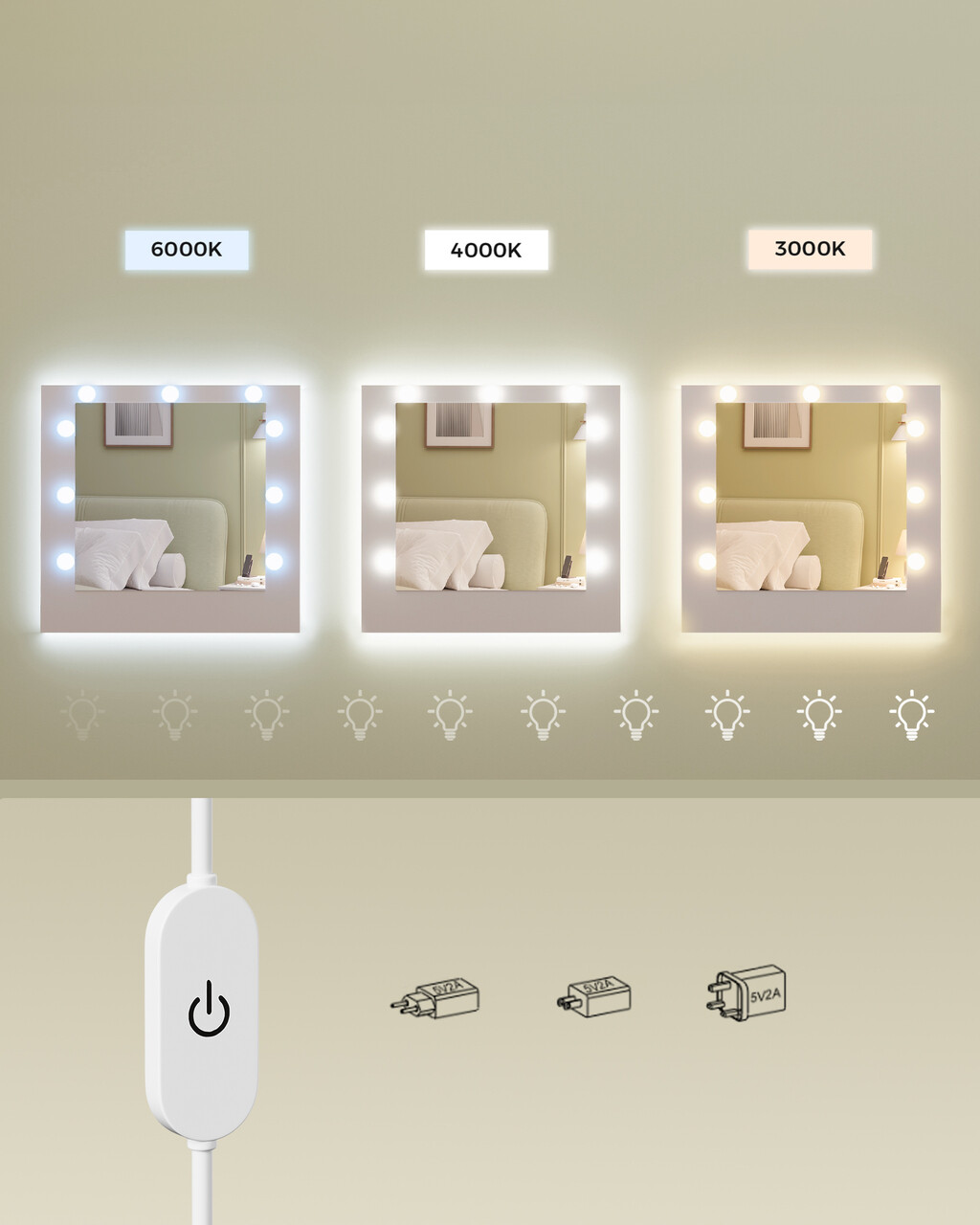 Cele 9 becuri din jurul oglinzii ofera 3 temperaturi de culoare – rece, naturala si calda – iar luminozitatea poate fi ajustata pentru machiaj perfect in orice moment al zilei.