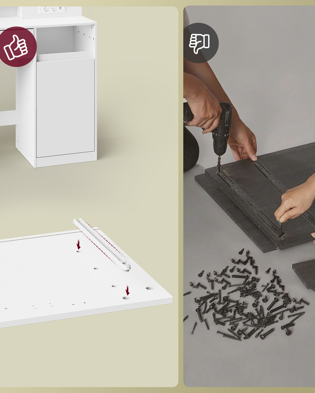 Sinele sertarelor se fixeaza prin sistem click direct pe corpul mesei, fara suruburi sau unelte.