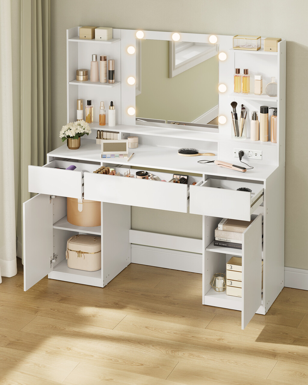 Blatul de 107 cm latime, cele 3 sertare, 2 dulapuri cu rafturi reglabile si cele 8 compartimente deschise ofera suficient loc pentru cosmetice si accesorii.