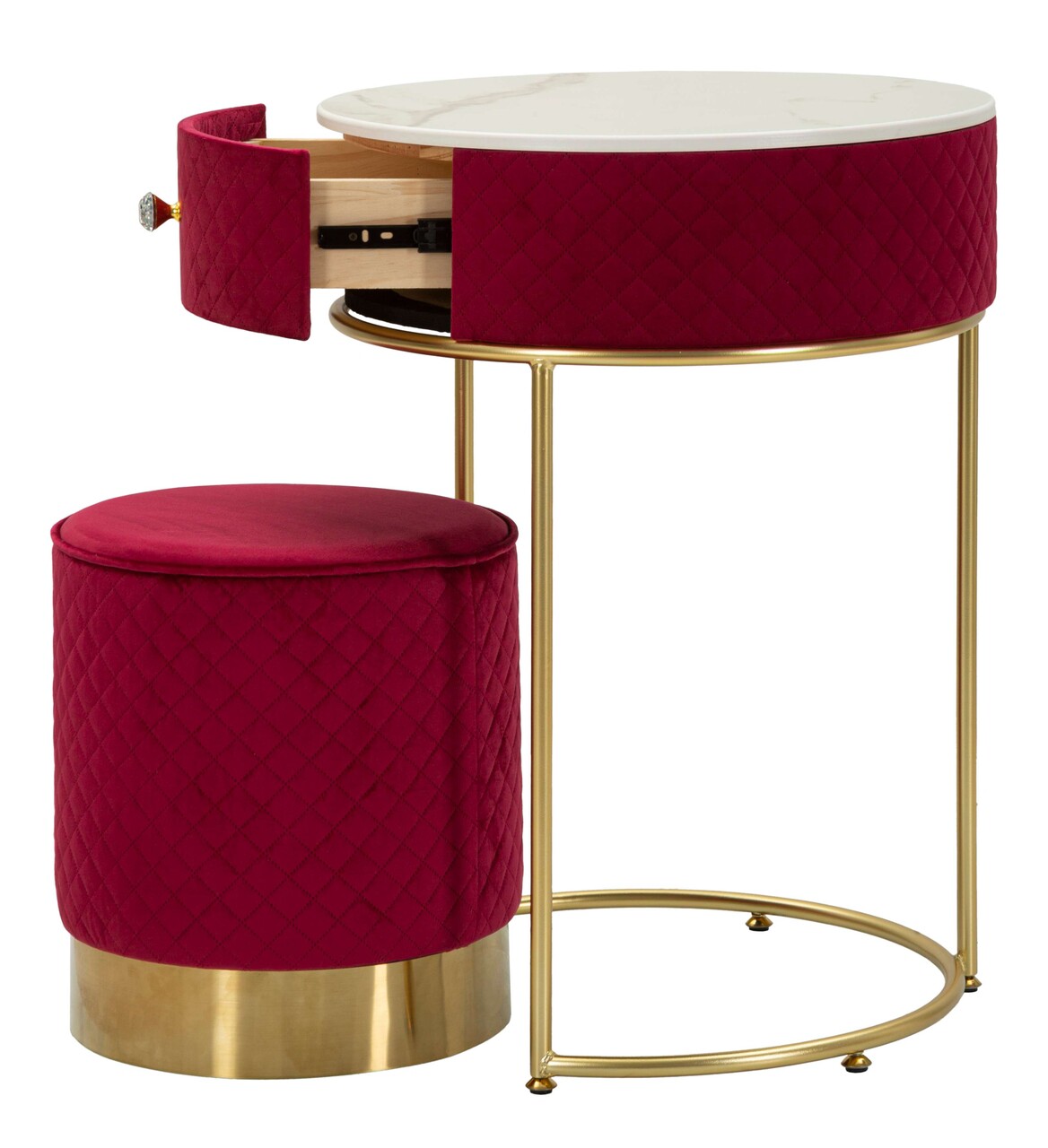 Un set cu un aer sofisticat, compus din masuta si taburet asortat in catifea rosie, accentuat de detalii metalice aurii. Ideal pentru interioare care isi doresc un plus de caracter, eleganta si culoare nobila. Dimensiuni interioare sertar: 30x30x8 cm.